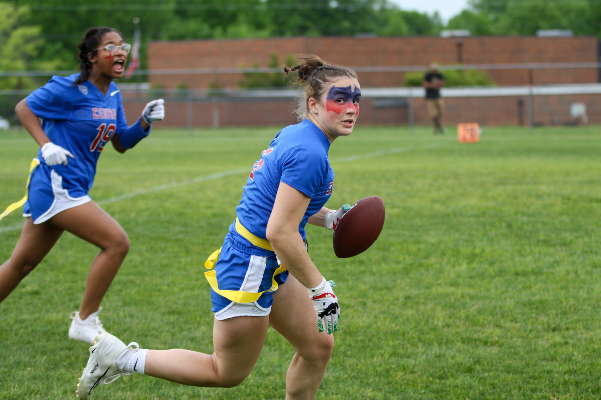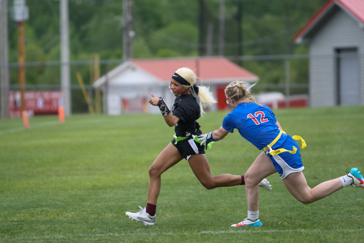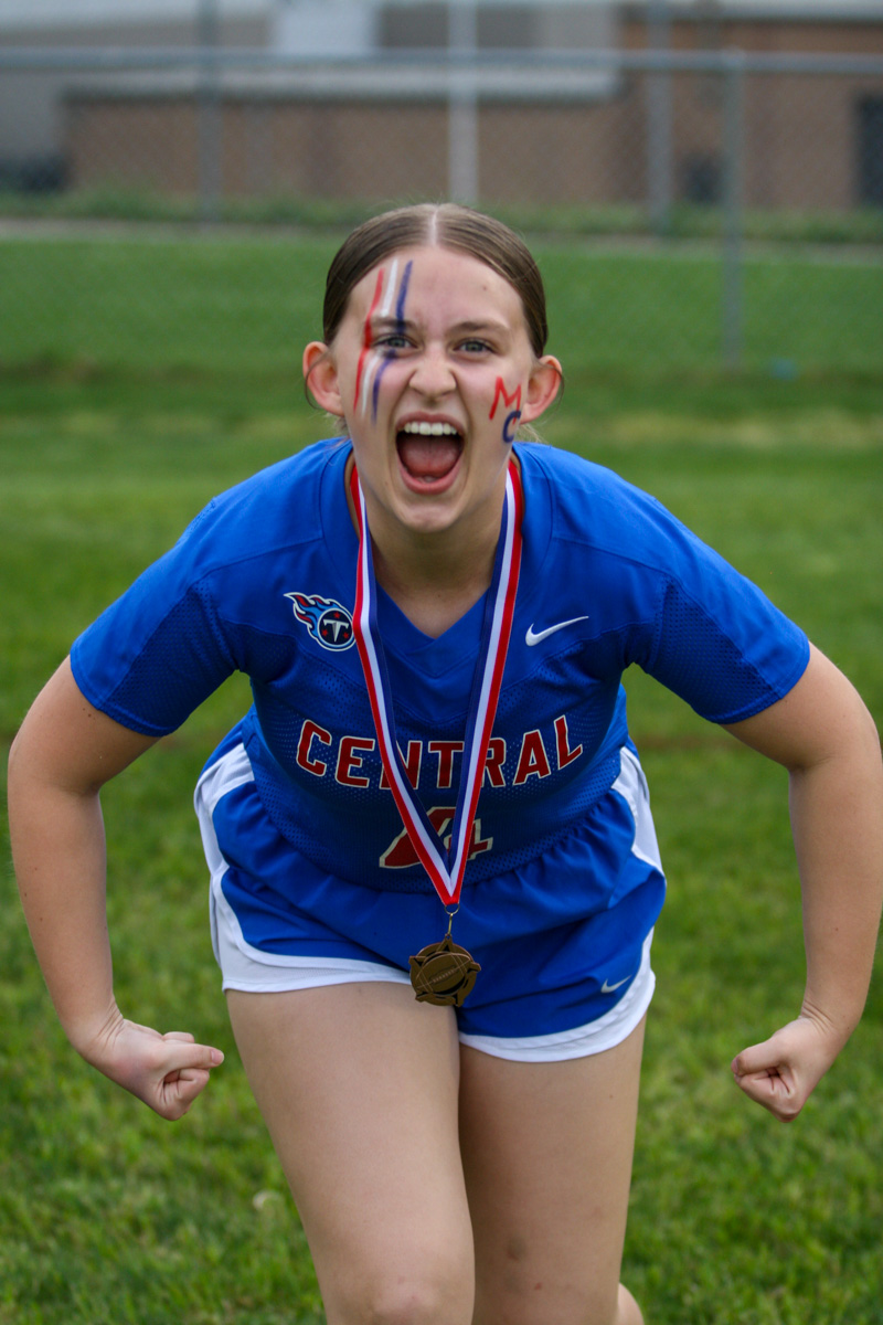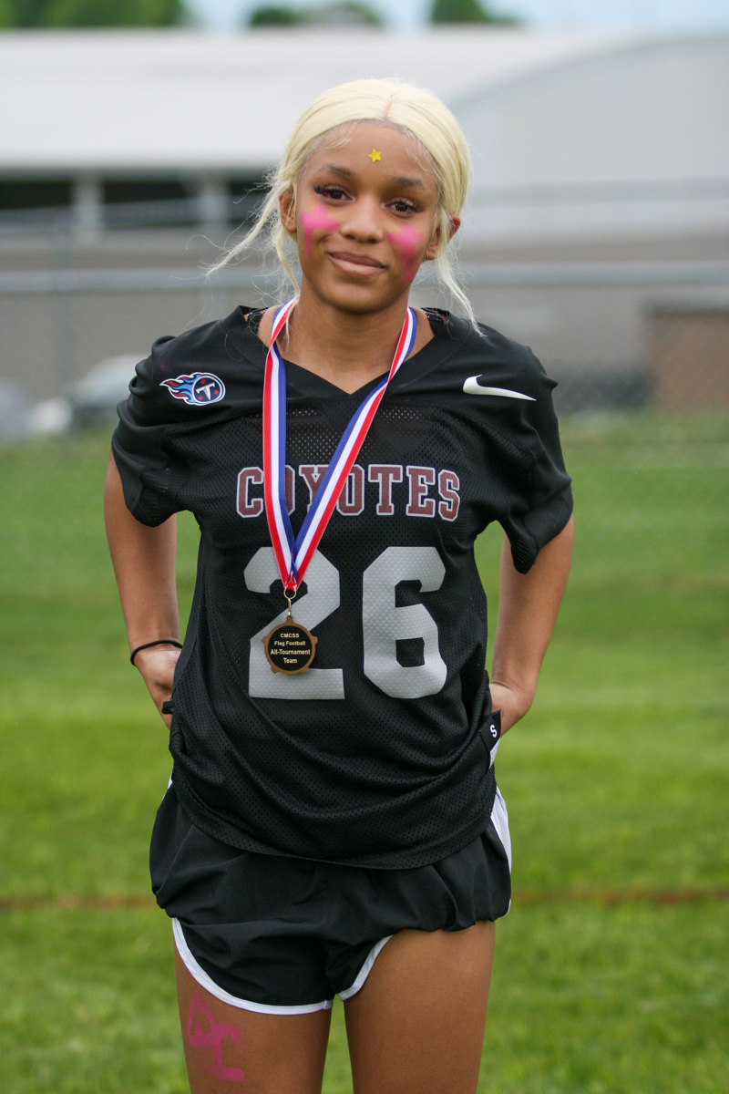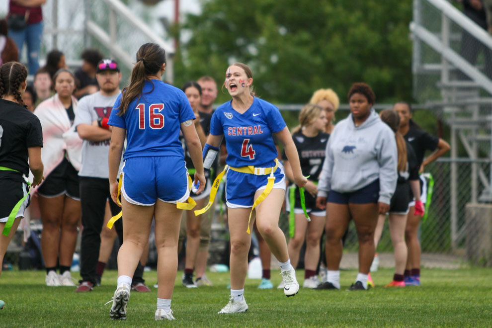 CLARKSVILLE, TN (CLARKSVILLE NOW) – The Montgomery Central Indians hosted the county high school flag football championship against the West Creek Coyotes, a rematch of the championship game last year, that the Coyotes won. A back-and-forth game, packed with loud fans from both teams, ended with a game-sealing interception by Audrey Levendusky, and Central got their revenge, winning 14-6.