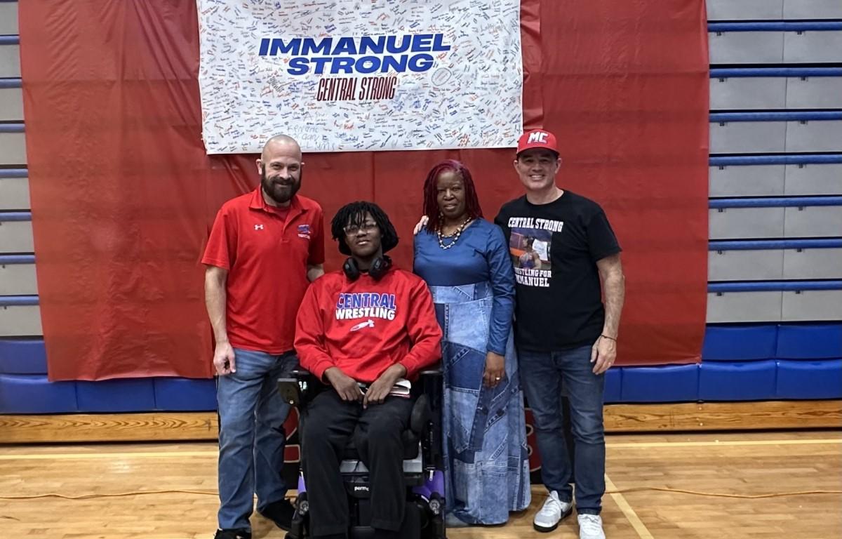 The crowd rose to their feet, giving Gimore a standing ovation after the emcee introduced him at the beginning of the event, saying, “We have watched as Immanuel has inspired thousands of people through his bravery, perseverance, and faith. Today we honor him by hosting our first-ever Immanuel Gilmore JV County Championships. Please give this courageous young man a round of applause to show our love and support.”