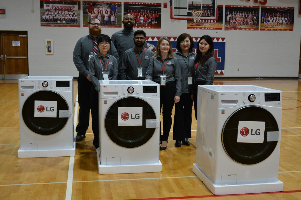 LG Electronics team members at Montgomery Central Middle School for the donation of three washers and three dryers to help the school keep the student’s athletic uniforms clean on Apr. 26, 2024. (Lee Erwin)