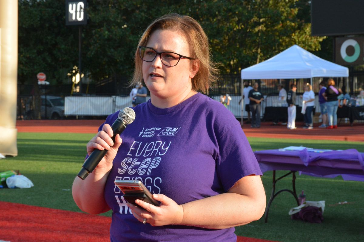 Ashley Grant shares her cancer survivor story as the community comes together to support the American Cancer Society at the Montgomery County Relay for Life fundraiser at APSU’s Fortera Stadium on Sep. 22, 2023. (Lee Erwin)