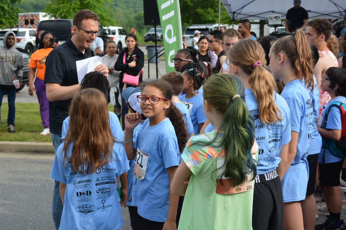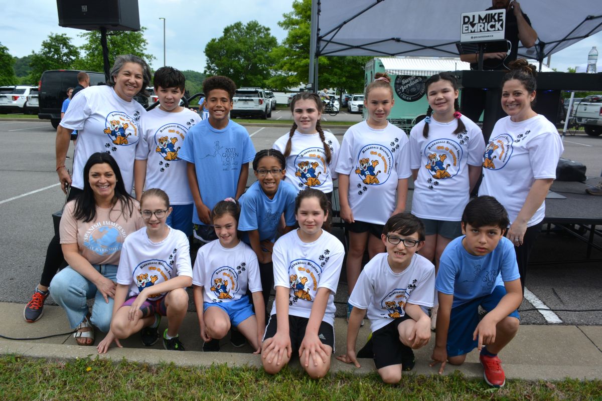 The Barksdale Elementary School Spanish Immersion Club at Clarksville Parks & Recreation’s 45th Annual Queen City Road Race at Liberty Park on May 13, 2023. (Lee Erwin)