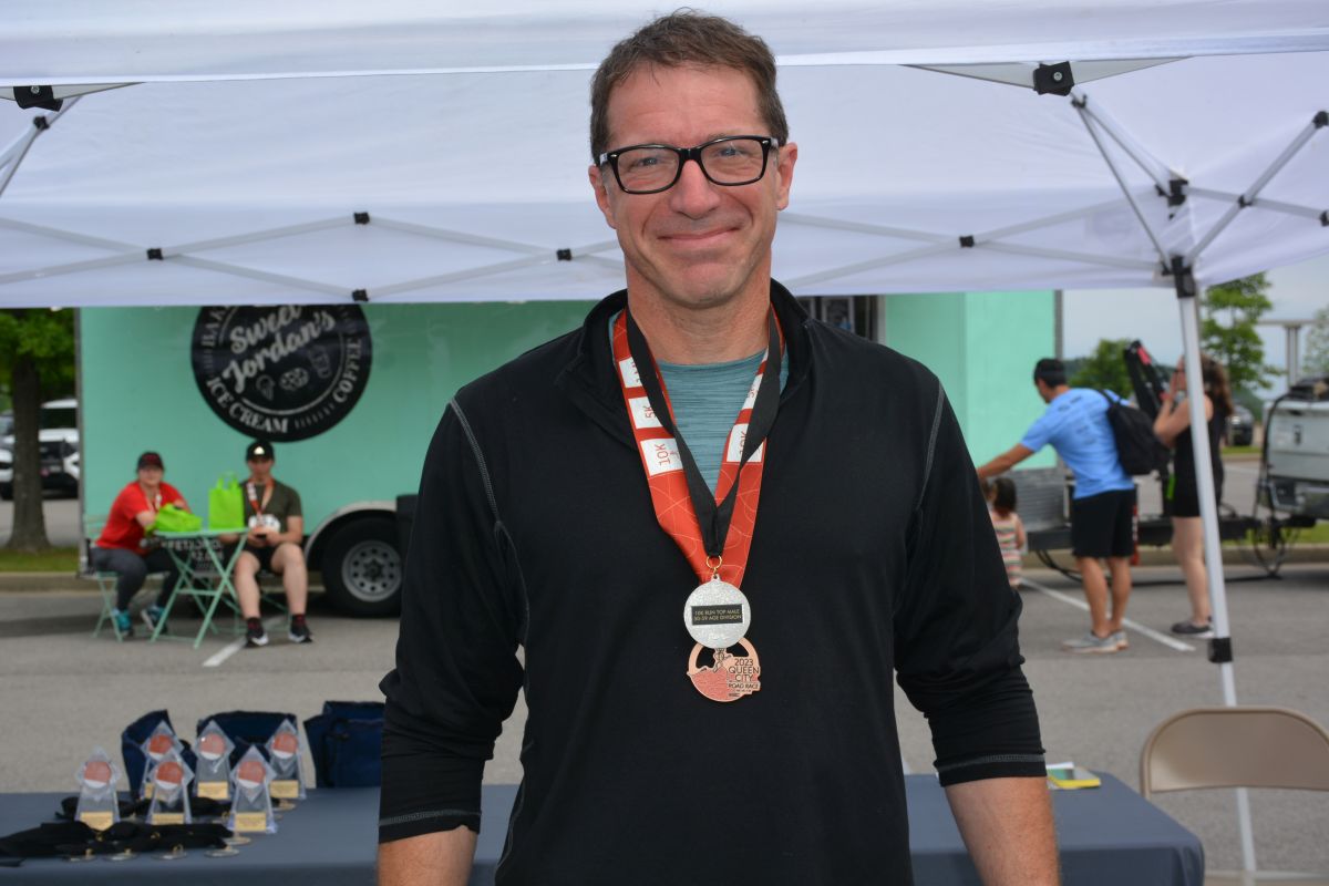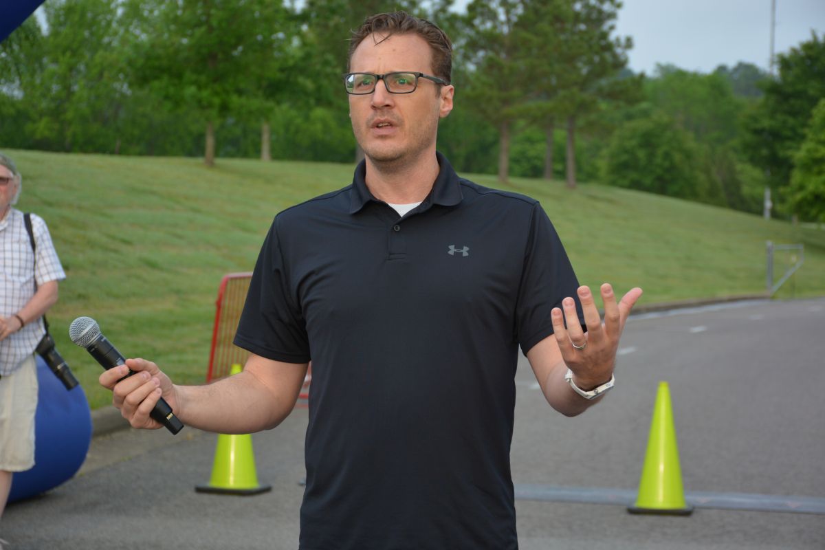 Ryan Ploeckelman with 5 Star Media Group emcee’s Clarksville Parks & Recreation’s 45th Annual Queen City Road Race at Liberty Park on May 13, 2023. (Lee Erwin)