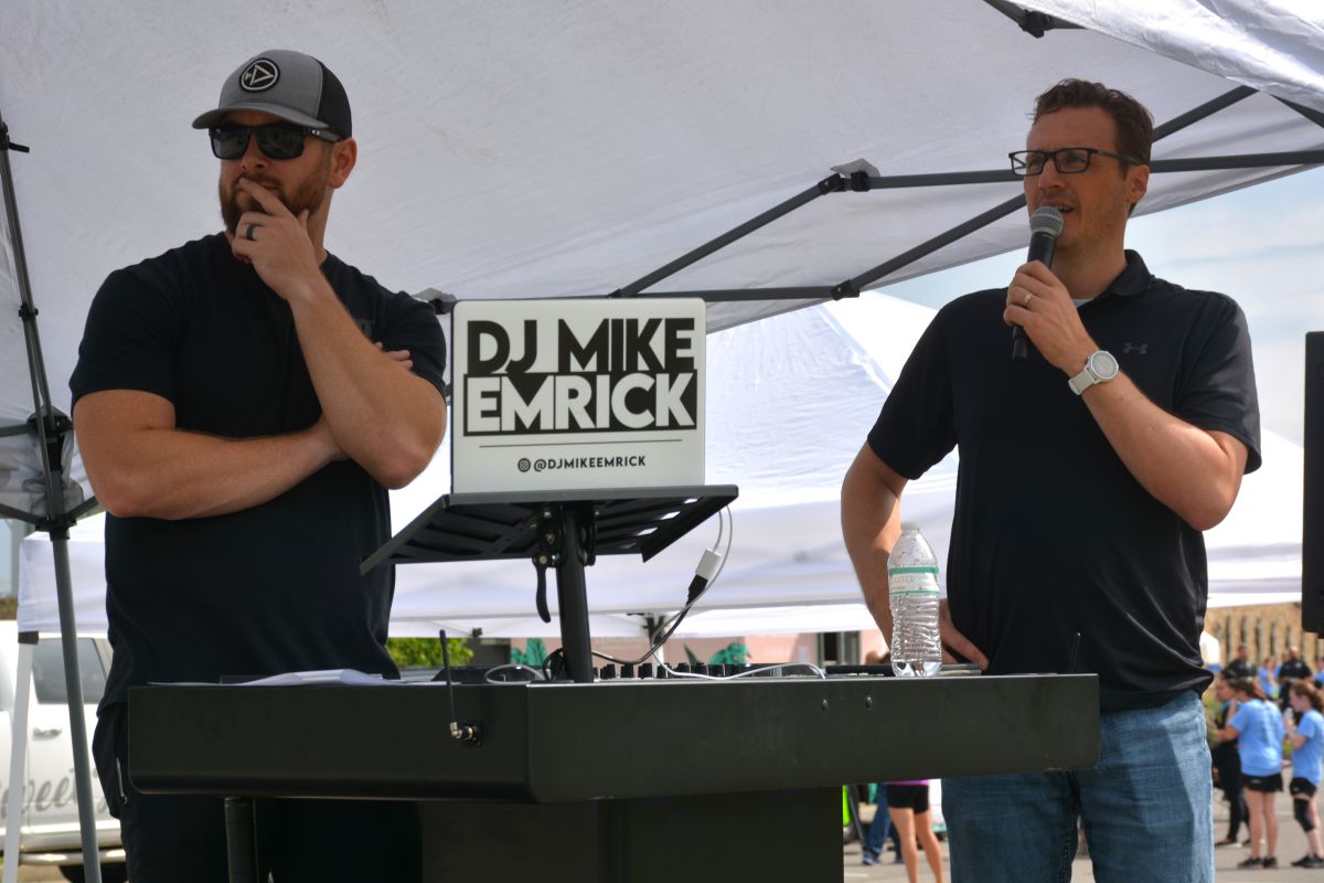 DJ Mike Emerick and Ryan Ploeckelman at Clarksville Parks & Recreation’s 45th Annual Queen City Road Race at Liberty Park on May 13, 2023. (Lee Erwin)