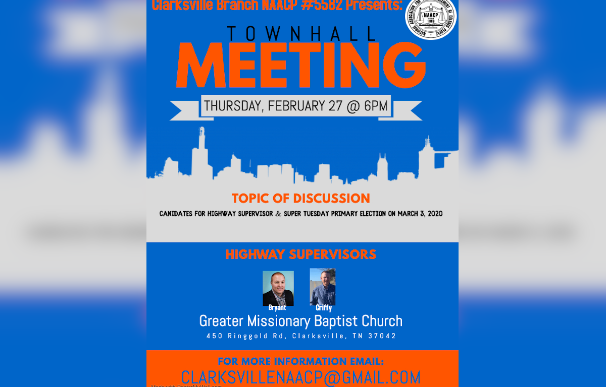 CLARKSVILLE, Tenn (CLARKSVILLENOW) – NAACP Clarksville Branch #5582 will hold a town hall meeting and political forum on Thursday, February 27, at Greater Missionary Baptist Church (450 Ringgold Road, Clarksville, Tenn 37042).