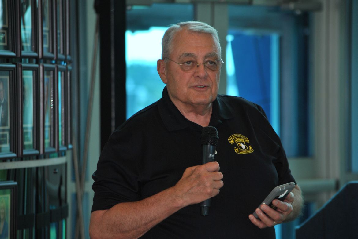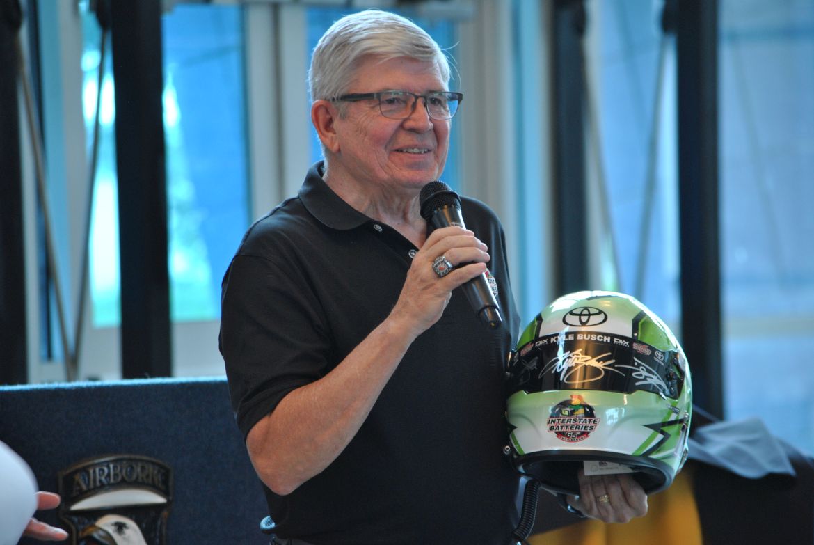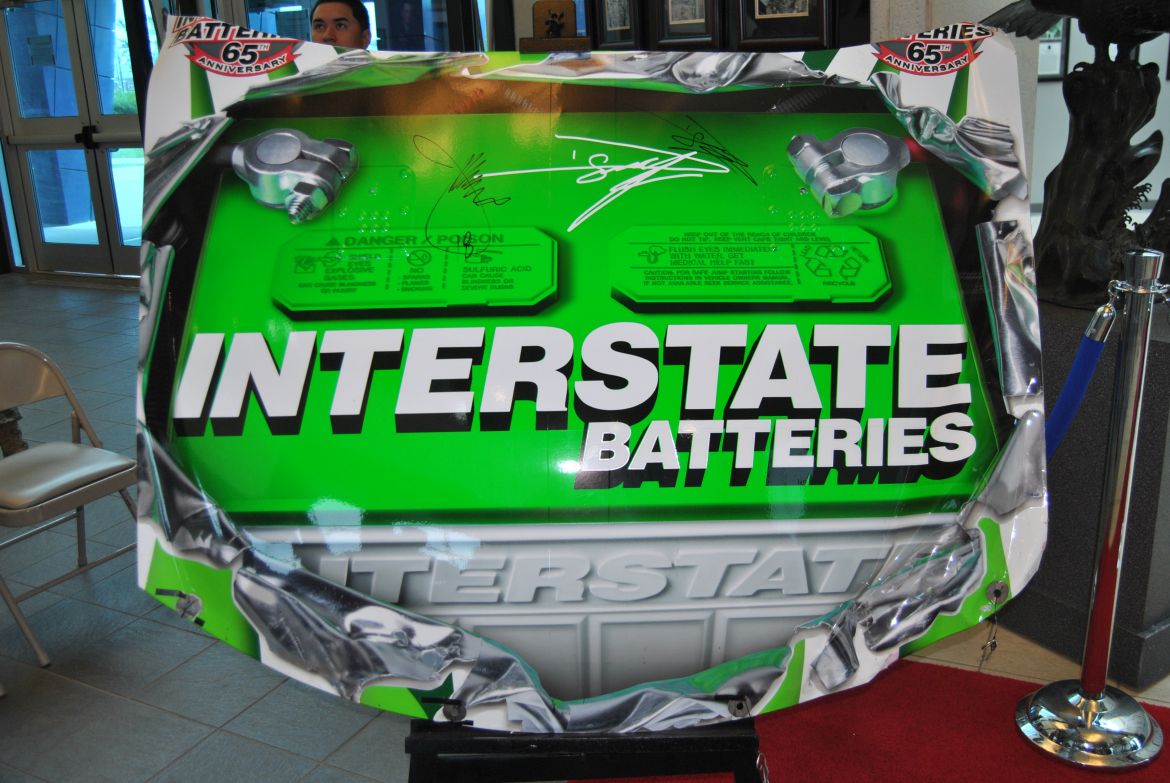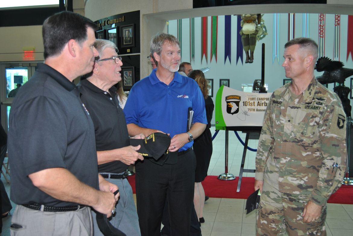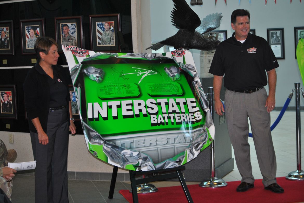 The race car pieces were presented by Chris Willis, VP Talent Group and Chief Legal Officer of Interstate Batteries, and Byron Goggin, Director of Sponsor Services with Joe Gibbs Racing. The President of the 101st Airborne Division Association, James Shamblen, accepted the race car pieces for the association.
