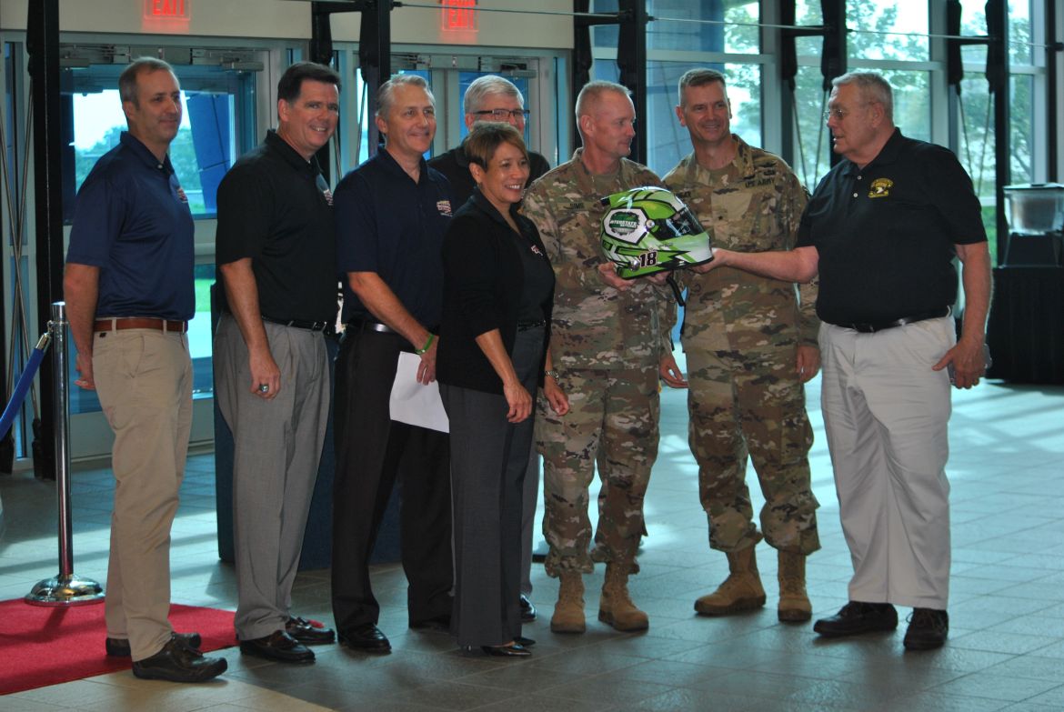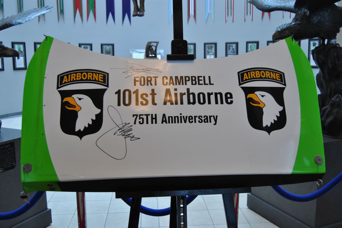The deck lid of the car was branded with “Old Abe” in honor of the 75th Anniversary of the 101st as they celebrate a Legacy of Heroism. A helmet signed by NASCAR’s Kyle Busch was also part of the donation and three 101st Soldiers who were at the race in June were given racing shirts and caps.