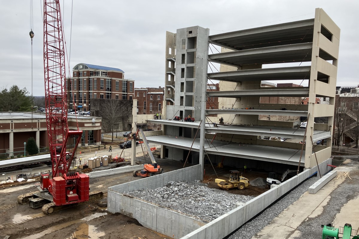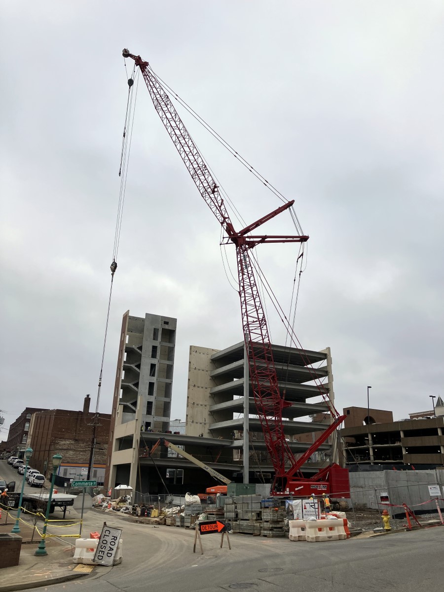 CLARKSVILLE, TN (CLARKSVILLE NOW) – Construction on the City of Clarksville’s new downtown parking garage has progressed to new heights, with a towering crane erecting the upper edge of the eight-deck facility.