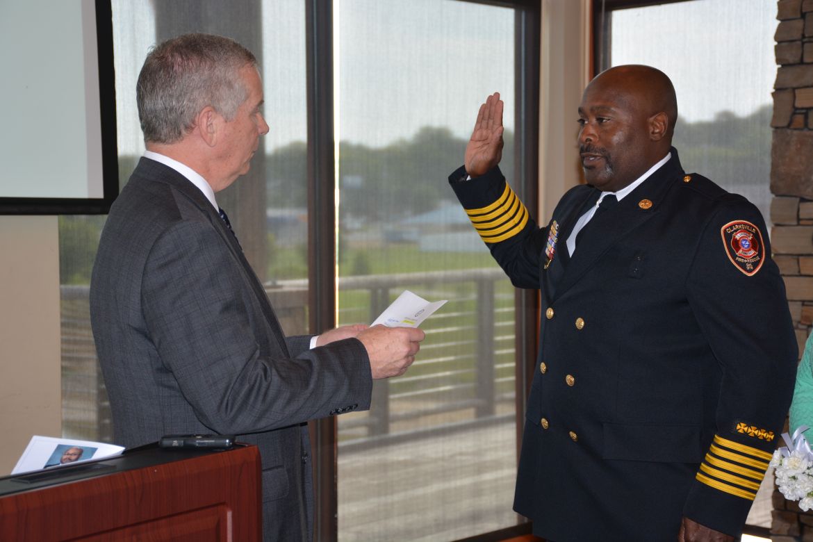 CLARKSVILLE, Tenn (CLARKSVILLENOW) – Clarksville Mayor Joe Pitts administered the oath of office to new Clarksville Fire Rescue Chief Freddie Montgomery Thursday, August 1. Firefighters, city and county officials filled Freedom Point at Liberty Park to welcome the new chief.