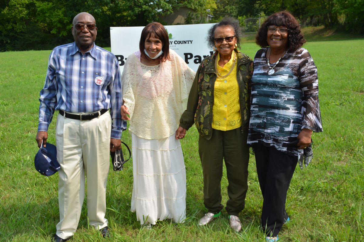 Rashidah Leverette, Minnie Brigham, Pastor James Brigham, and Tony Eldridge at the announcement of plans for the new Brigham Park at the corner of Daniel St. and Central Ave. on, Aug. 1, 2022. (Lee Erwin)