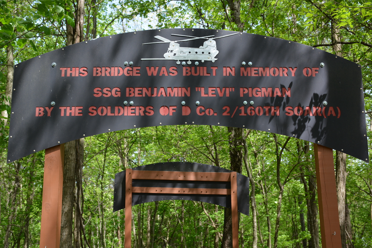The trail has been used a place to commemorate more than just those in the 160th SOAR who were killed in action. A bridge over a runoff creek was erected by the D Company, 2nd Battalion soldiers of the 160th for Staff Sgt. Benjamin “Levi” Pigman, who collapsed and died at 25 after completing a half marathon in Nashville in 2009.
