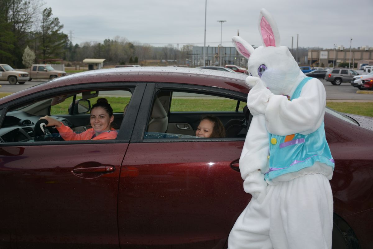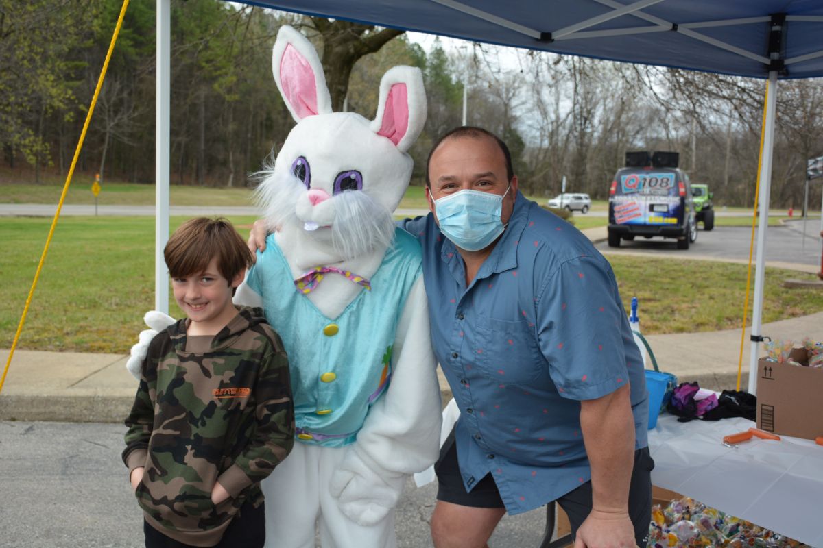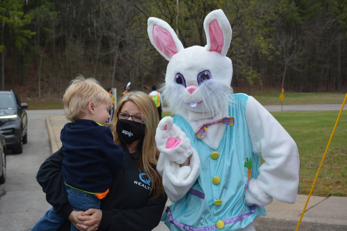 The Easter Bunny entertains the kids as volunteers pass out candy and prizes at the Nyrstar Community Drive-Thru Easter Egg Hunt Mar. 27 2021 (Lee Erwin).