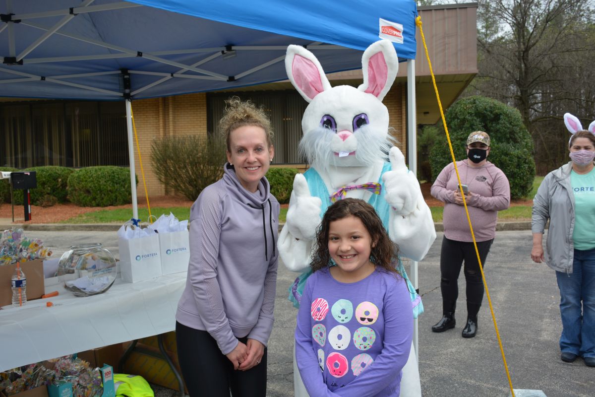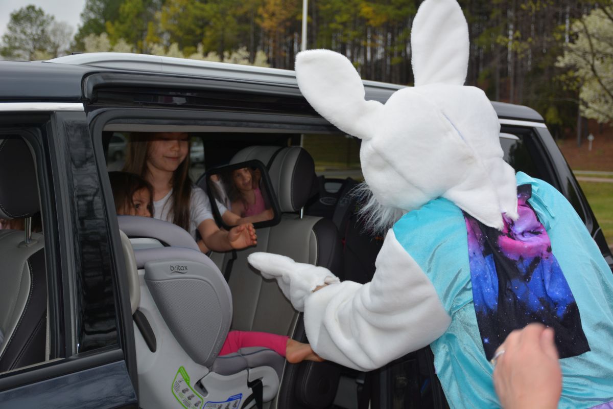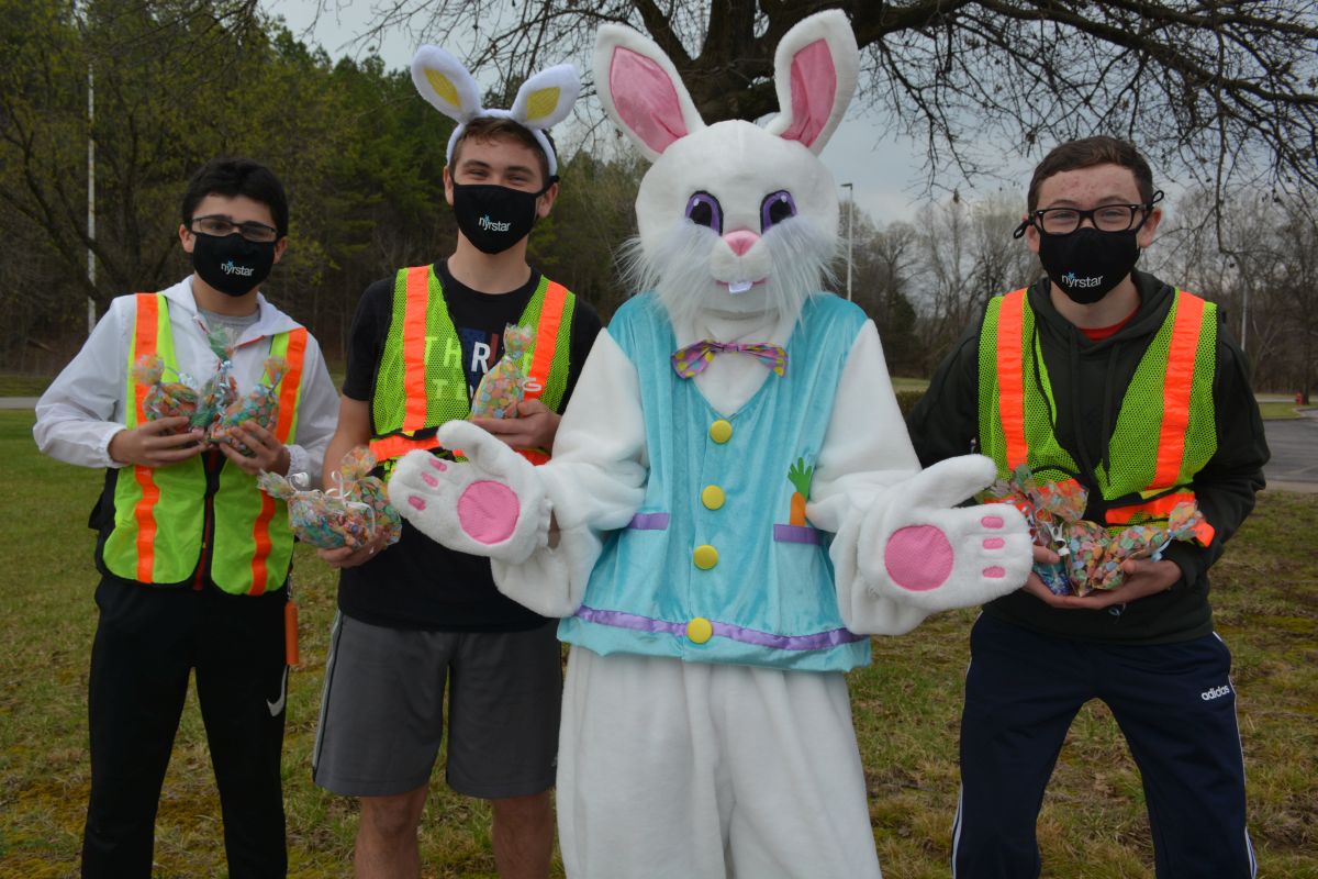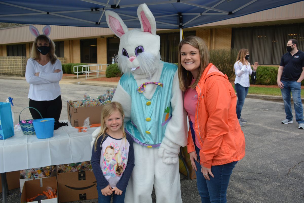The Easter Bunny entertains the kids as volunteers pass out candy and prizes at the Nyrstar Community Drive-Thru Easter Egg Hunt Mar. 27 2021 (Lee Erwin).