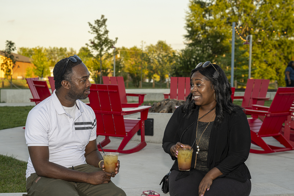 Jocelyn Martinez relaxing by the fire at the Chamber Business After Hours at Old Glory Distillery. September 19, 2024. (Jeff Danault)