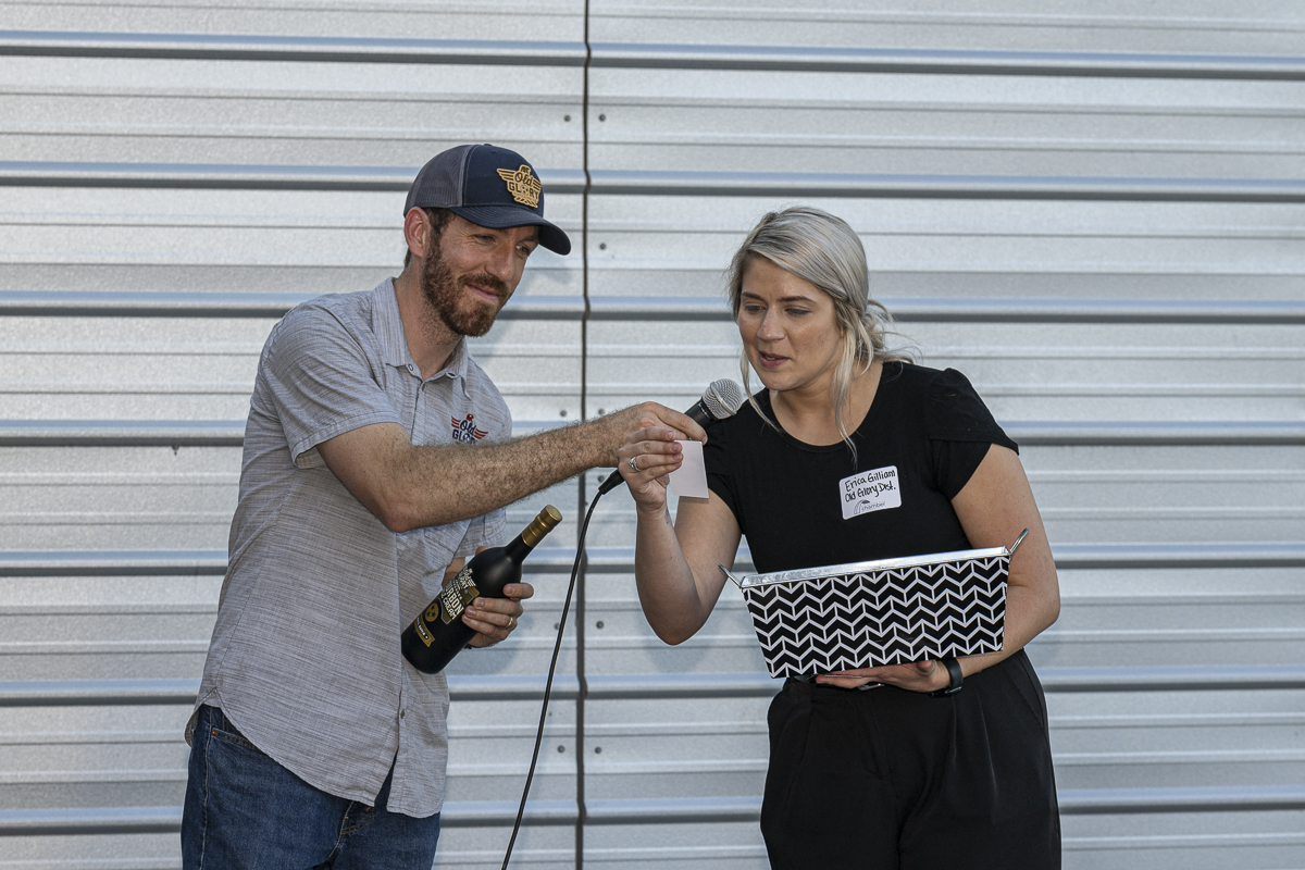 Matt Cunningham and Erica Gilliam announcing the door prizes at the Chamber Business After Hours at Old Glory Distillery. September 19, 2024. (Jeff Danault)