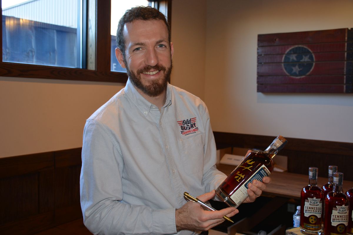 Matt Cunningham, Founder of Old Glory Distilling Co., signs a bottle at the Inaugural Release of the distillery’s Tennessee Whiskey and Bourbon on Sat. Nov. 27,2021. (Lee Erwin).