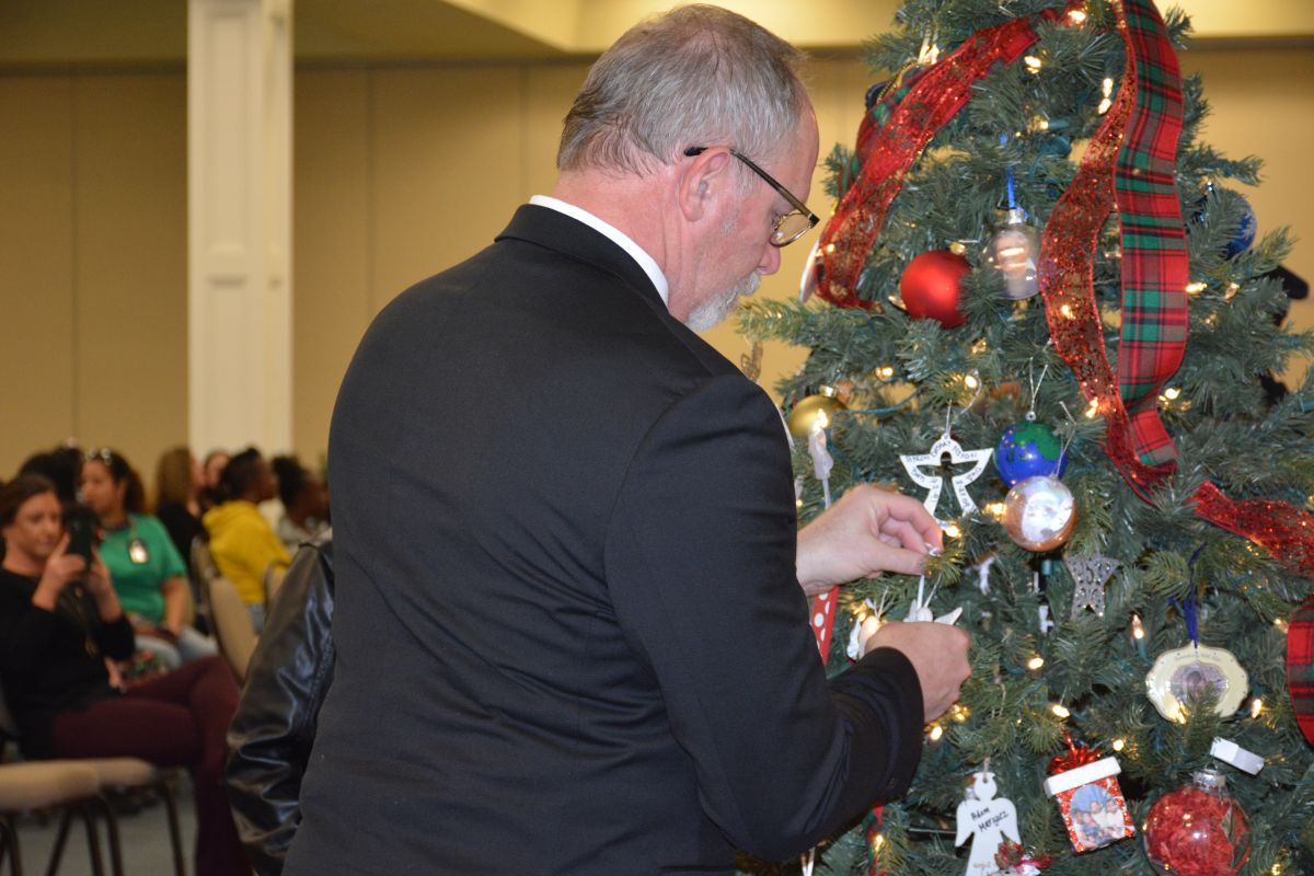 District Attorney General Robert Nash places an ornament on a Christmas tree to honor the memory of a victim of homicide for the On Wings of Love ceremony at First Baptist Church, on Dec. 6, 2022. (Lee Erwin)