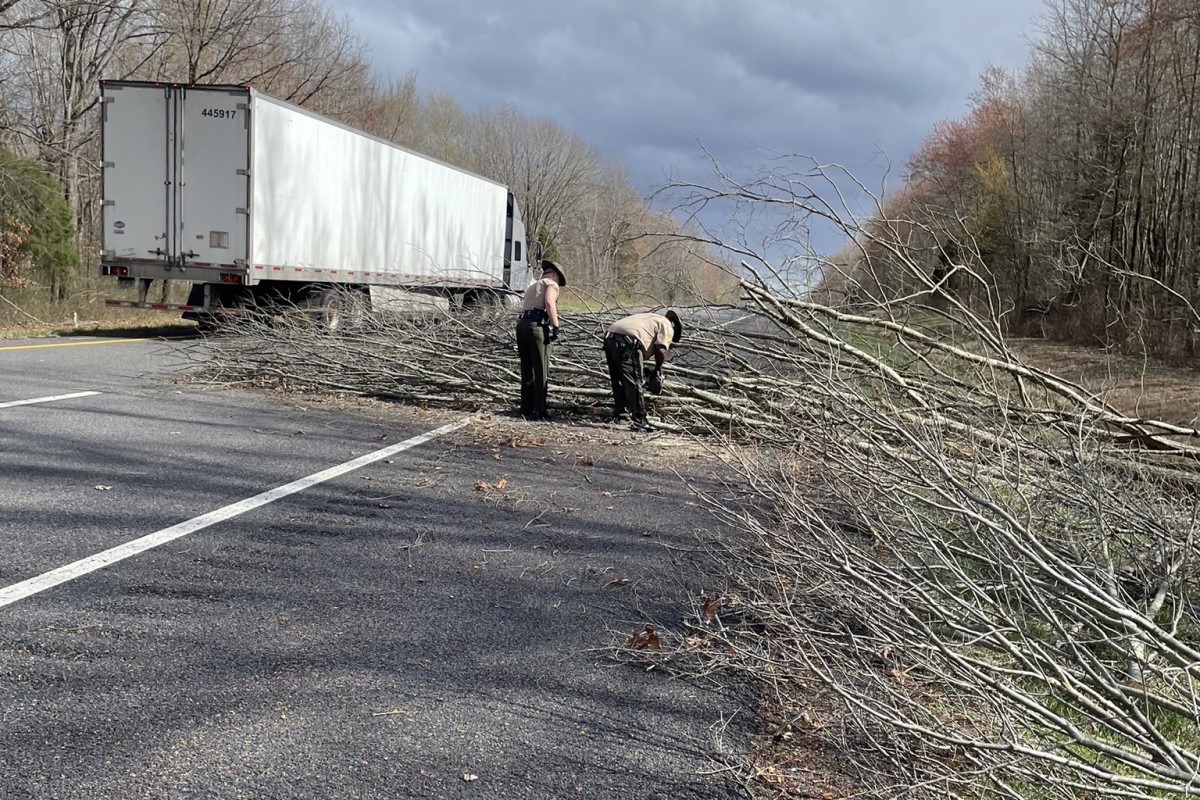 Sgt. Young and Trooper Hawkins clear trees on Interstate 24 in Montgomery County on March 3, 2023. (THP, contributed)