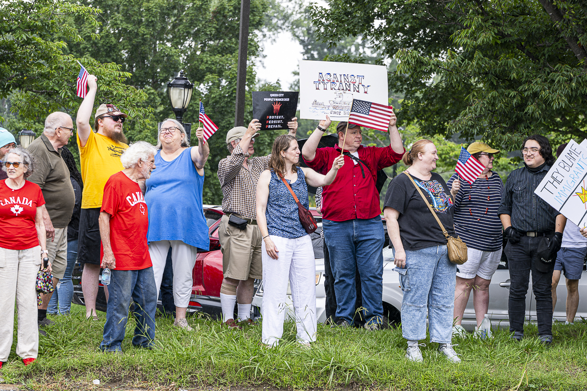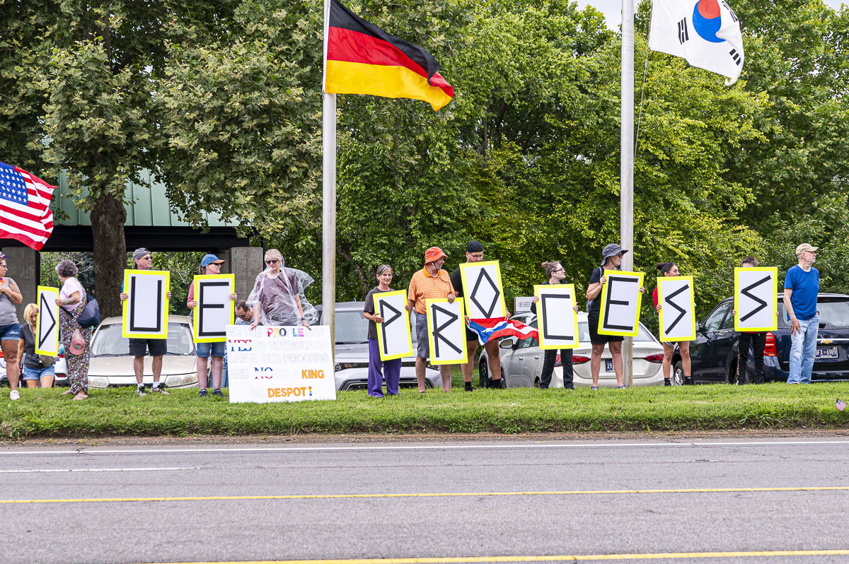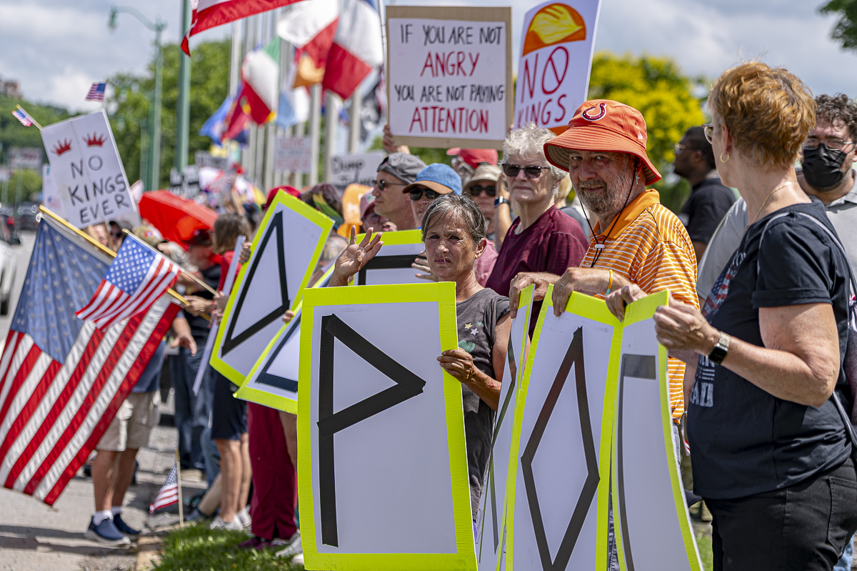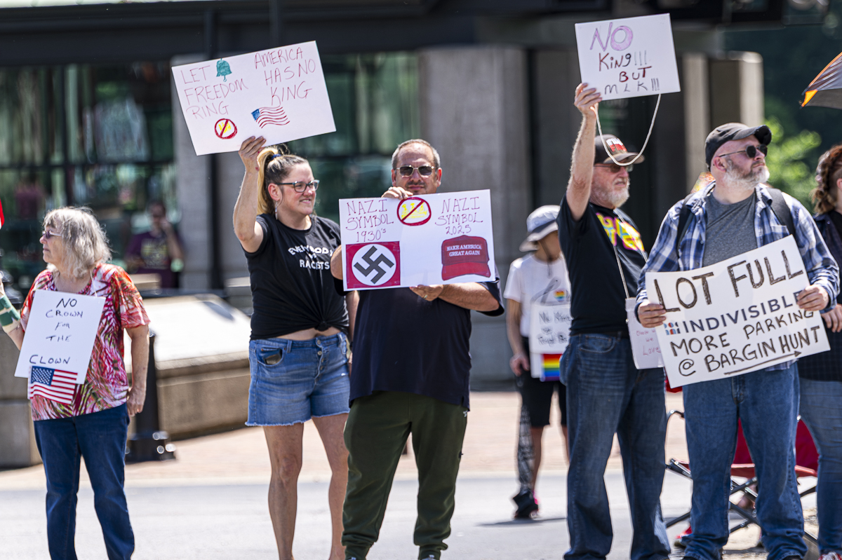 Protesters held up signs and chanted responsively, “Tell me what democracy looks like! This is what democracy looks like! No kings! No kings!”