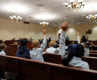 A courtroom full of students from Immaculate Conception School (ICS) held a mock trial facilitated by Judge Adrienne Fry in her courtroom at the Montgomery County Court Center.