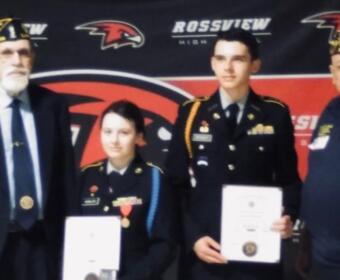 On April 7 at Rossview High School, Post 289 2nd Vice Commander Ernest Schmidt and Post Adjutant Bob Grigsey awarded two JROTC Awards to cadets Capt. Garrison Depriest and Kamiliya Aumiller.