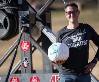 APSU’s resident mad scientist celebrated his birthday by launching flaming pumpkins across the Dunn Center lawn with a catapult.