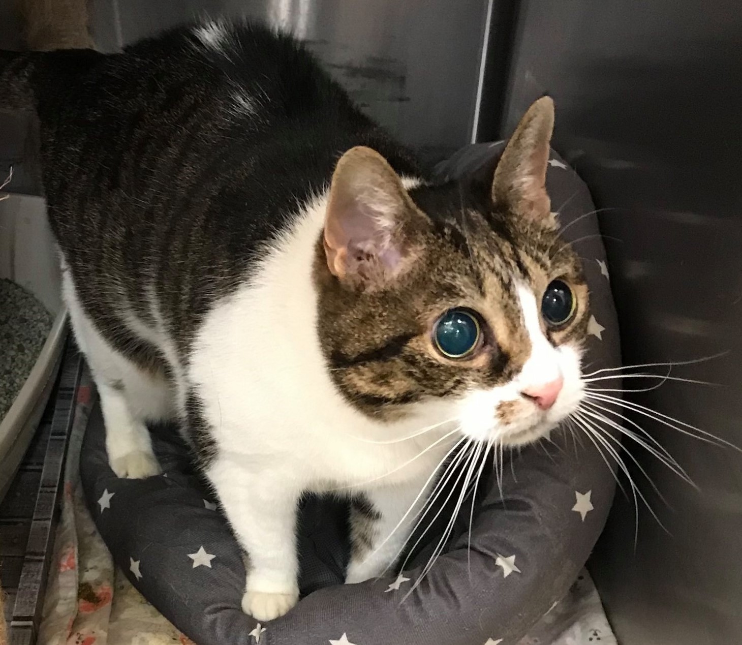 Marrie is a special needs cat looking for a loving home. An owner surrender, she is 13 years-old, a short-haired tabby and white kitty, and she is blind. She loves people, is a talker only if you ignore her, is alert, intelligent, and just a delight. She is not fond of other cats, and would like to be the queen bee of her home. She gets around very well and would soon have a new home mapped. If you love senior kitties, this one is a gem.