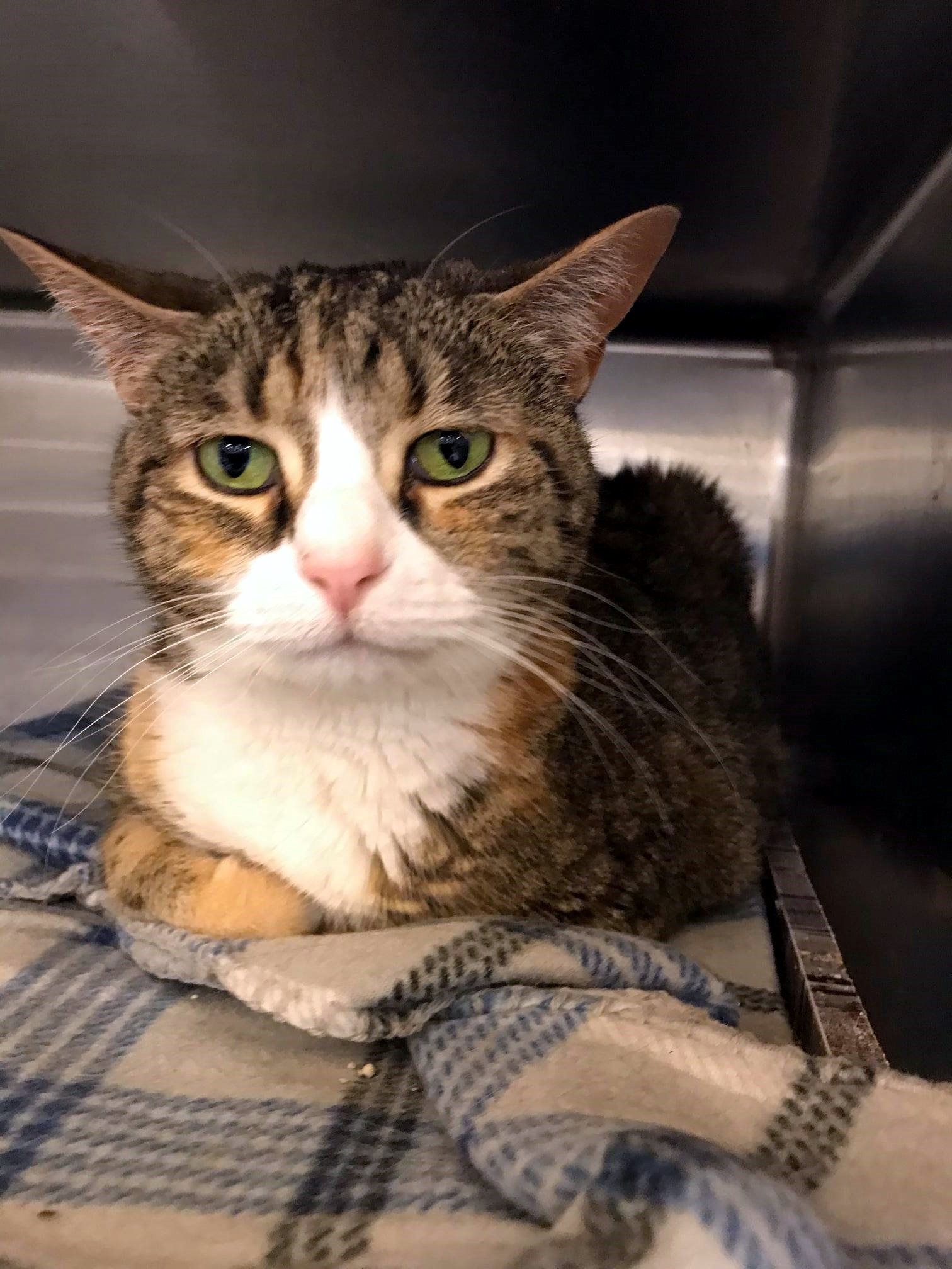 Yurushi is a very pretty 6-year-old female tortoiseshell tabby with stunning emerald eyes. She is a calm kitty who knows her own mind. Her owner had to give her up due to ill health. Yurushi is patiently waiting for the right person to be her forever friend. She has lived with other cats. She is vetted, neutered, and litter trained.