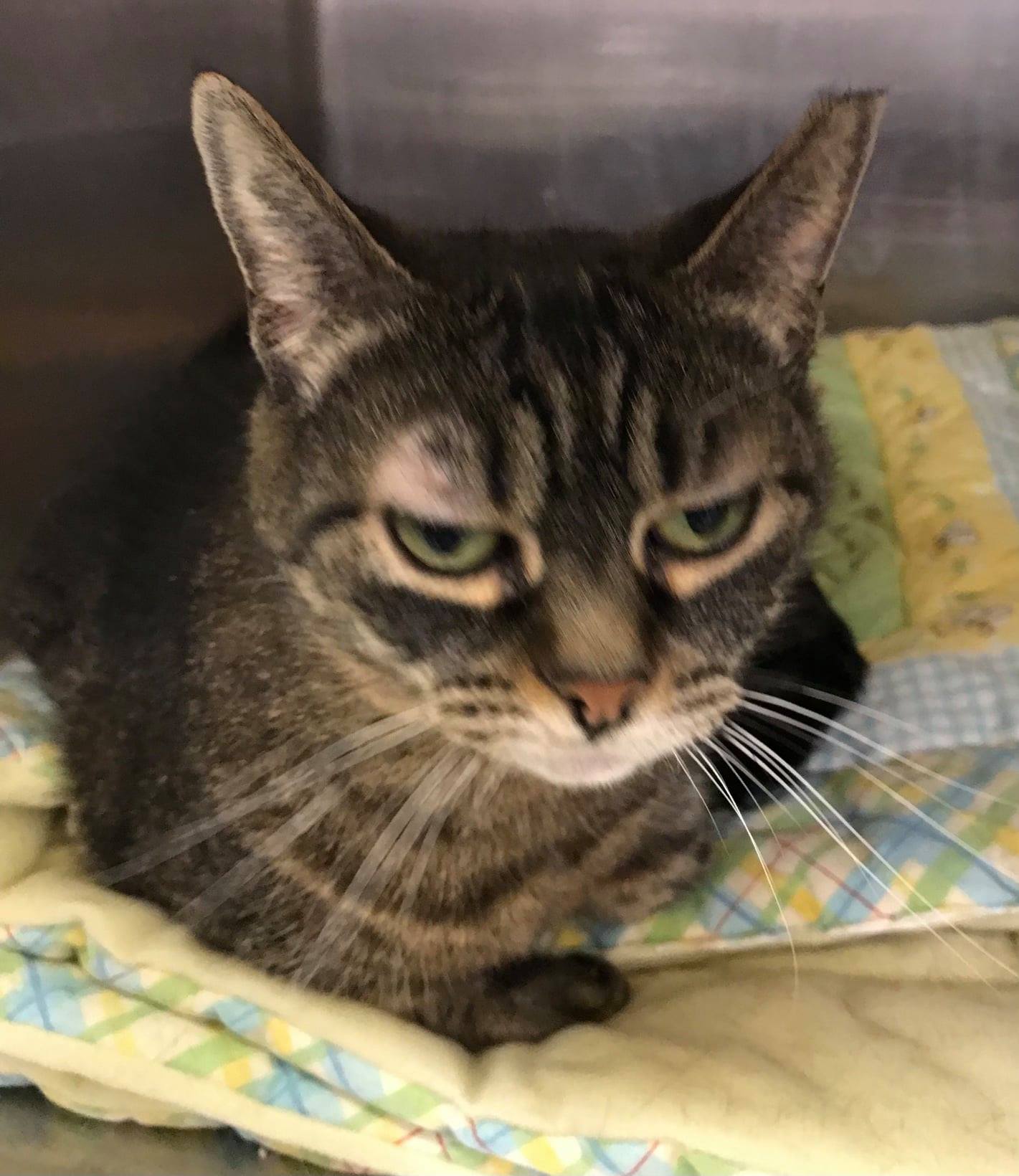 Cleo is a small, sweet, female, 12-year-old senior girl. She is a gray Tabby with beautiful and unusual eyes. She is current on vaccinations, spayed and litter trained. She takes a minute to warm up but quickly comes around for affection and pats. Cleo would be happy as an only cat. She has years of love to give to a companion looking for a quiet, sweet girl. If you would like to meet Cleo she is currently available at PetSmart on weekends from noon to 4PM or by appointment through Cats Are Us, 931-503-0053, www.facebook.com/catsareustn