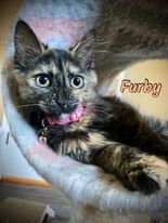Furby is ready for pre-adoption. She tends to be a bit shy with new people and would do best in a quiet home. Furby is very playful and entertains herself by running back and forth in her kitty tunnel, then resting and relaxing inside her cat tree condo. She gets along with other cats and calm dogs. She is fully vetted, spayed and litter trained. She will make a great addition to your family!