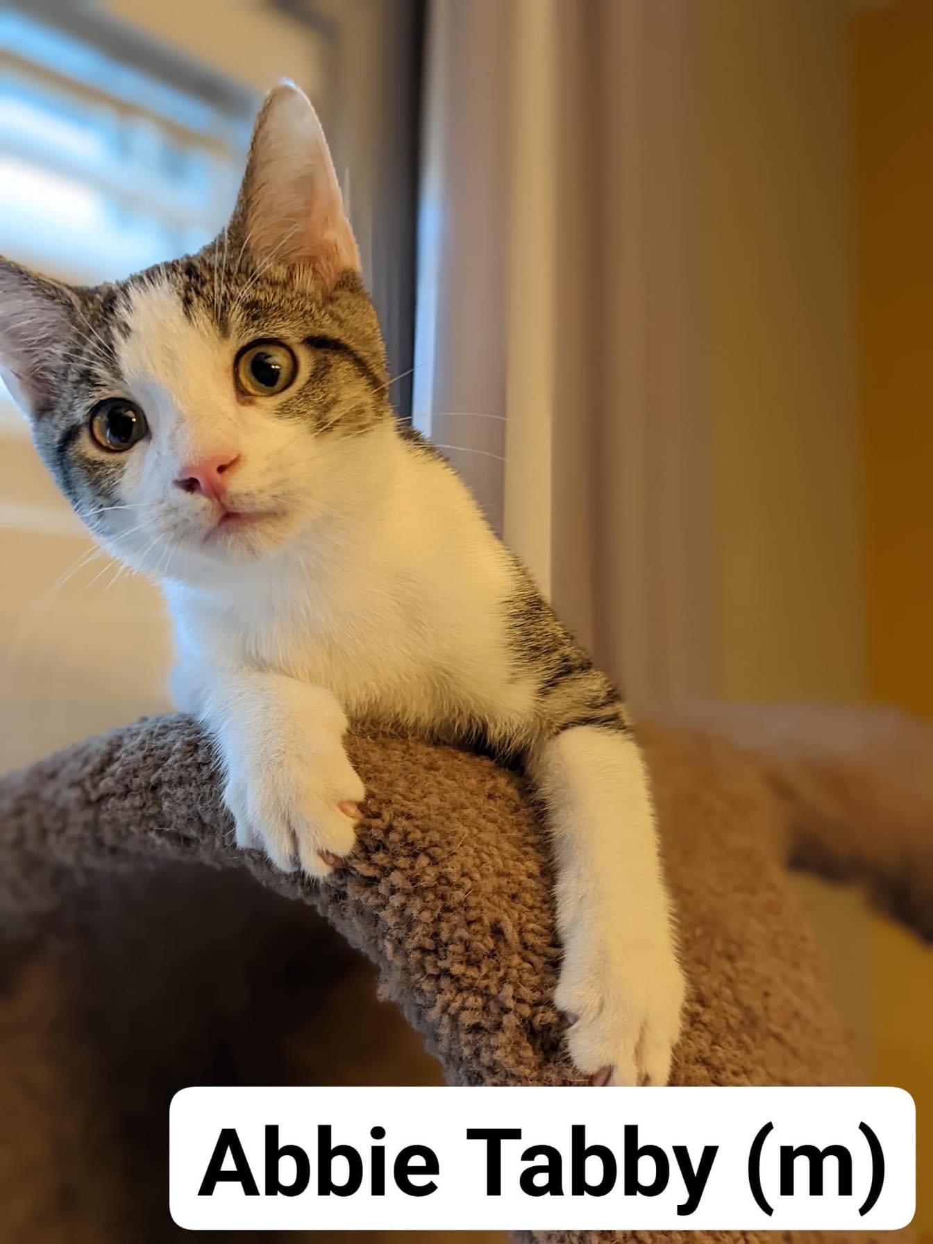 Abbi Tabby is a 5-month-old male Domestic Shorthair! He is fully vetted, litter trained and ready for his forever home. He is extremely sweet, affectionate and very social. He loves giving kisses and being snuggled. He does well with other cats and enjoys playing with toys.
