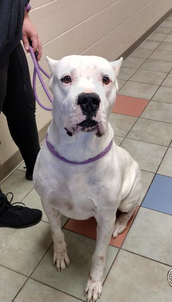 Moose is an adult male Dogo Argentino. He is fully vetted and will be neutered before going home. Please Note: DO YOUR RESEARCH on this breed before adopting. They are along the lines of a Mastiff breed. They are loyal to their family but highly territorial and wary of strangers. They need large amounts of room, exercised regularly and were originally bred for hunting and protection. They can make wonderful companions but must be socialized and trained properly. They can weigh upwards to over 100 pounds. They need a strong ALPHA leader who can set consistent boundaries. For more extensive details, MCACC will be glad to answer your questions.