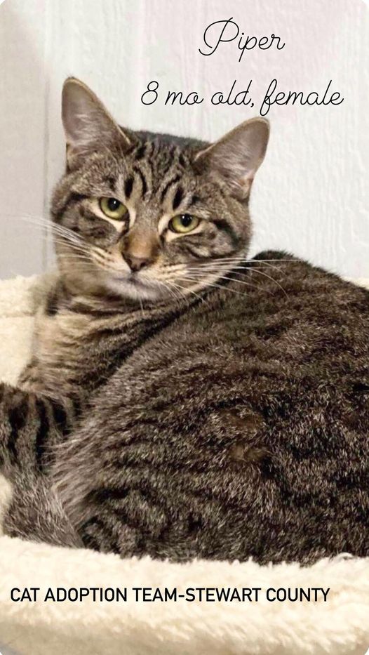 Piper is a lovely 8-month-old female kitten. She is fully vetted, spayed, dewormed, on flea prevention, Negative on FELV/FIV testing and litter trained. Piper is rather quiet and shy and will be a wonderful addition to any family. She can be found through the Cat Adoption Team (CATS). Contact Susan @ 931-305-8212 text or leave a message or message through their FaceBook page: http://www.facebook.com/CatAdoptionTeamOfStewartCountyCATS