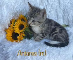 Antares is a young male Mackerel Tabby kitten. He is roughly 10 weeks old, fully vetted, neutered, and litter trained. This lovebug enjoys being with his people so much he literally wraps himself around your neck like a scarf! Antares absolutely loves playing with his siblings, plays hard and long with them, and would really benefit from another high-energy, playful cat in the home. He is good with children as well but has not been around dogs. To set up a meet and greet and for more information on all the cats please go to https://www.puurrrfectpawsrescue.com or message them through their FB page, Puurrrfect Paws Rescue & Cafe.