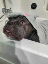 Gracie is a 4-year-old female Pocket pittie. She is fully vetted, microchipped, on all preventatives, not spayed yet and does love chasing cats but is overall good with them. She has been around children 6 and older and done fine with them and just loves everyone and everything, including spa days! Gracie is a great girl and has so much love to give to the perfect forever family! To set up a meet and greet and an application please call or text 822-827-9015 or email mmcbride@kayleesisland.com