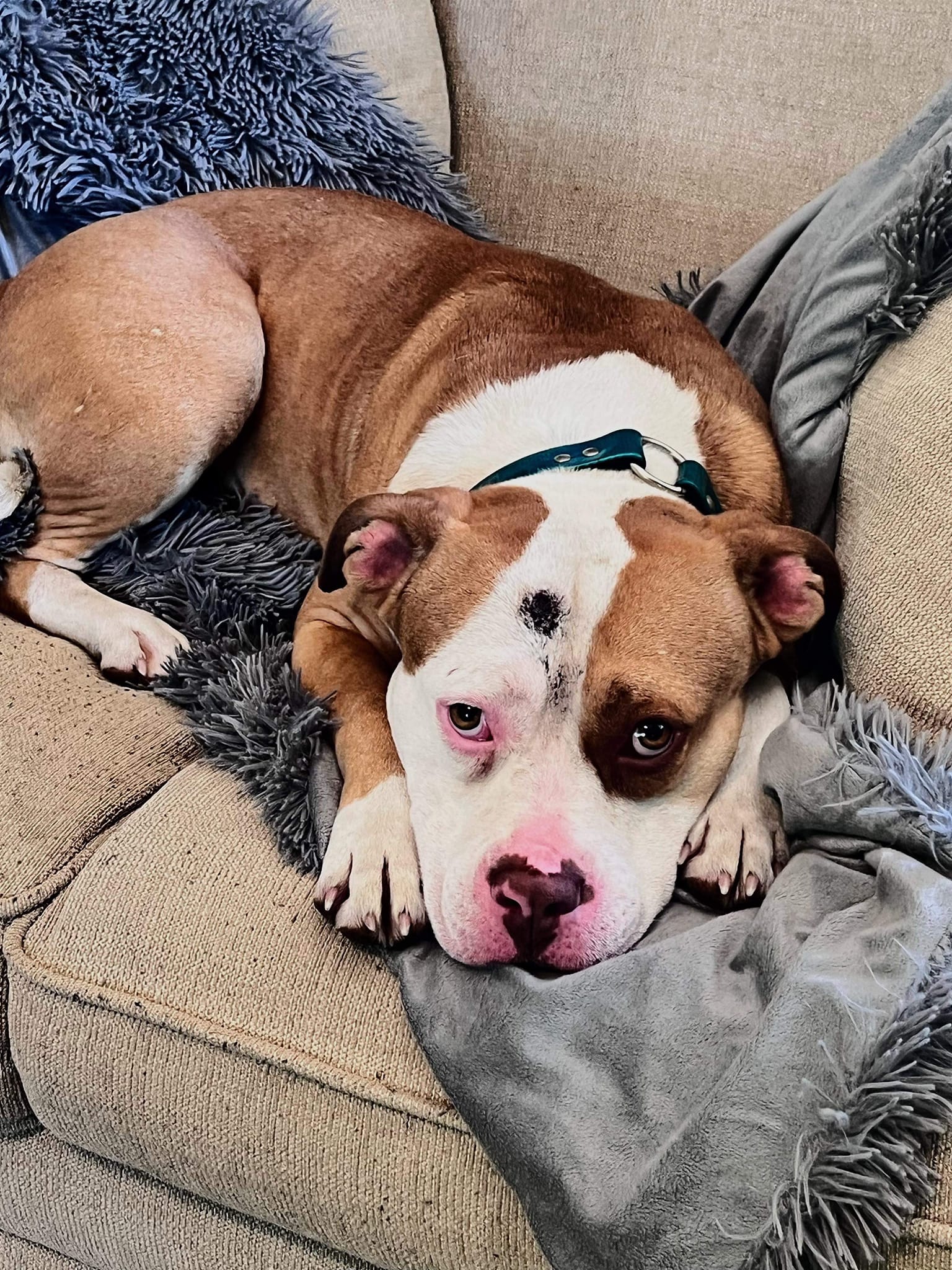 Ashes is a 2-year-old pit mix. This beautiful soul is sadly a victim of a cruel through and through the ears gun blast injury and burned on top of his head and by sheer luck or just a slight turn of his head he has no neurological or residual auditory issues from his injury! He is still on meds, fattening up with a decent healthy diet, fully vetted, will be neutered soon, and is an absolute sweetheart considering everything he has had to endure. Ashes does very well with all the puppies and dogs at the rescue, but not sure about cats. Absolute dream of a boy looking for his forever home. If you are looking for that special new family member and would like an application and more information, please reach out to Lisa at Sagley’s Biker Bully Farm, (785) 207-5641 or https://www.facebook.com/SBBF.Rescue. Lisa is usually running adoption events each Sunday with a ton of adoptables at the Petsmart on Wilma Rudolph (weather permitting) and you can always check her FB page to confirm times!