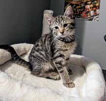 Cookie Jr. is a 9-week-old male Domestic shorthair. He is vetted and neutered and enjoys being held, playing with interactive toys and wrestling with his siblings. Cookie was handled by children in his foster home and is comfortable with kids. Cookie loves snuggling in small boxes, climbing cat trees and looking for attention. To fill out an application, set up a meet and greet and for more information on all the cats please go to https://www.puurrrfectpawsrescue.com or message them through their FB page, Puurrrfect Paws Rescue & Cafe.