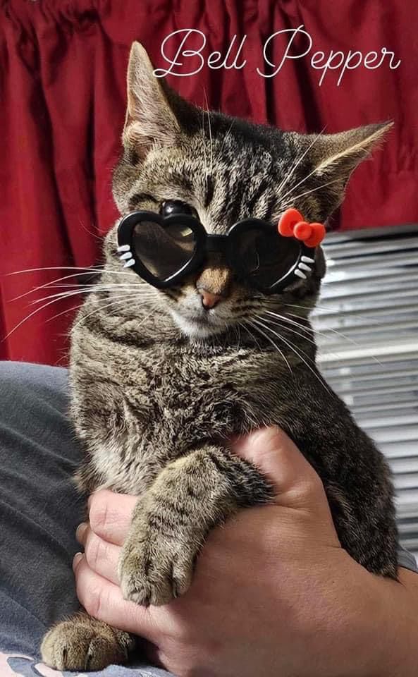 Bell Pepper is a Domestic Shorthair/Tabby mix young female cat. She is fully vetted, spayed, litter trained and good with dogs, cats and children. She is a bit petite and very lovable. She is playful, snuggly, quite the fashionista with her sunglasses and will make a wonderful companion. If you would like an application and more information please message them on FB or https://www.petfinder.com/member/us/tclarksville/finders-keepers-cat-rescue-tn984/ Or email finderskeeperscatrescue@gmail.com.