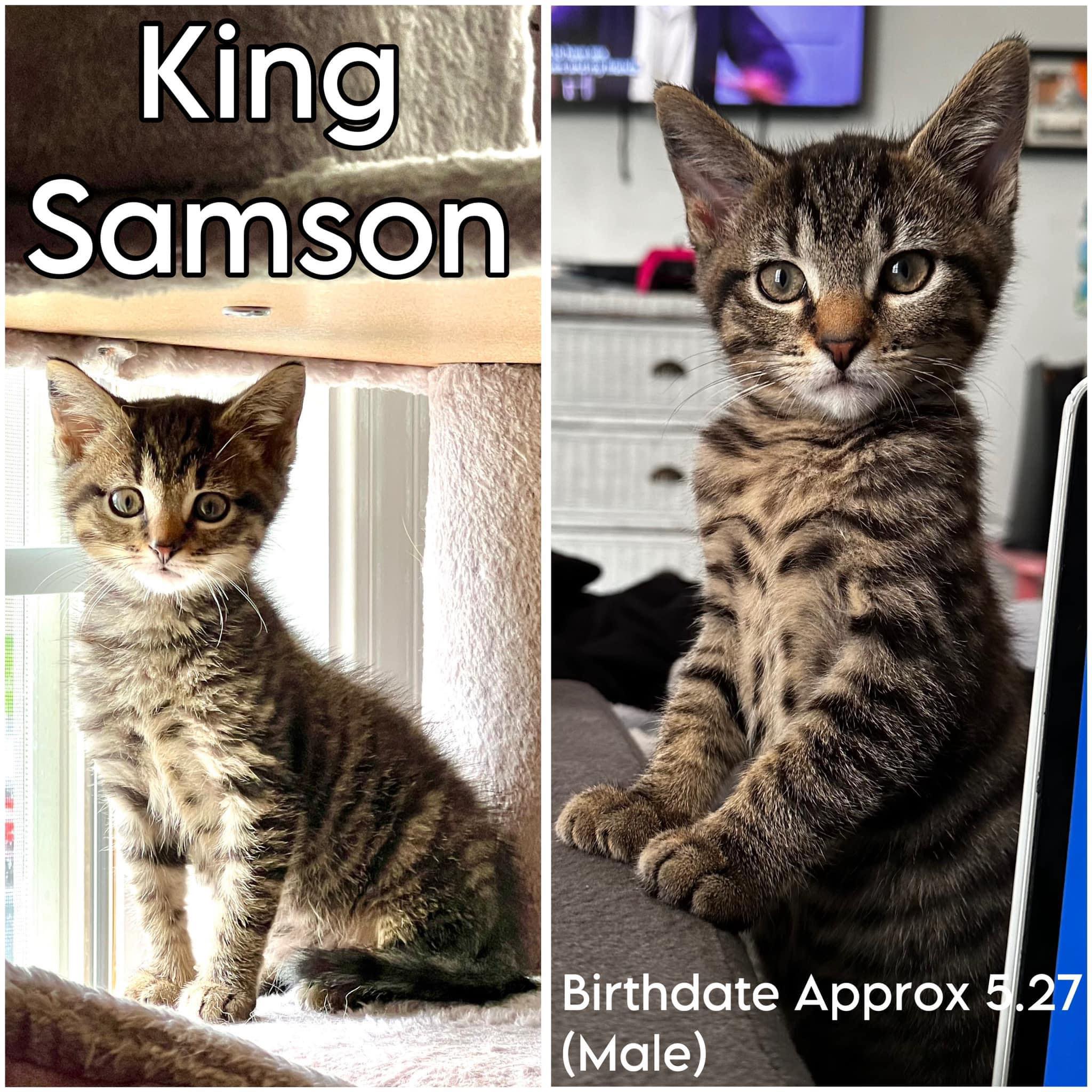 King Samson is a delightful kitten who was found alone and wandering the streets at 4 weeks old. He is now fully vetted and litter trained. He is very social, thriving in his foster home right now while waiting for his forever family and plays with other kittens and cats very well. He is so funny and loving and doesn’t mind kids or even dogs. He’s the perfect mix of chill and playfulness. He will be a wonderful addition to your family. To fill out an application, set up a meet and greet and for more information on all the cats please go to https://www.puurrrfectpawsrescue.com or message them through their FB page, Puurrrfect Paws Rescue & Cafe.