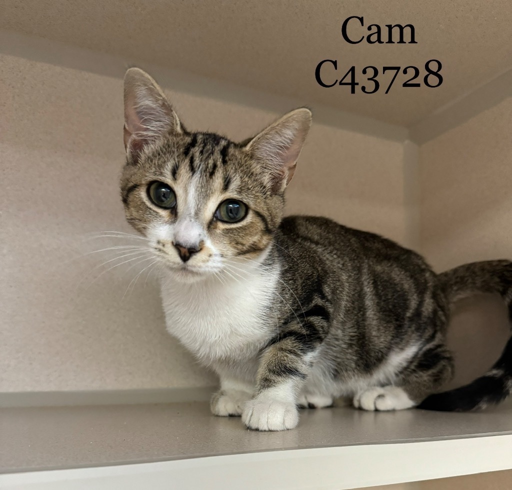 Cam is a small 14 week old male DomesticShorthair mix kitten. He is fully vetted, neutered and litter trained. This boy is a gentle sweetheart. He can go home the same day.
