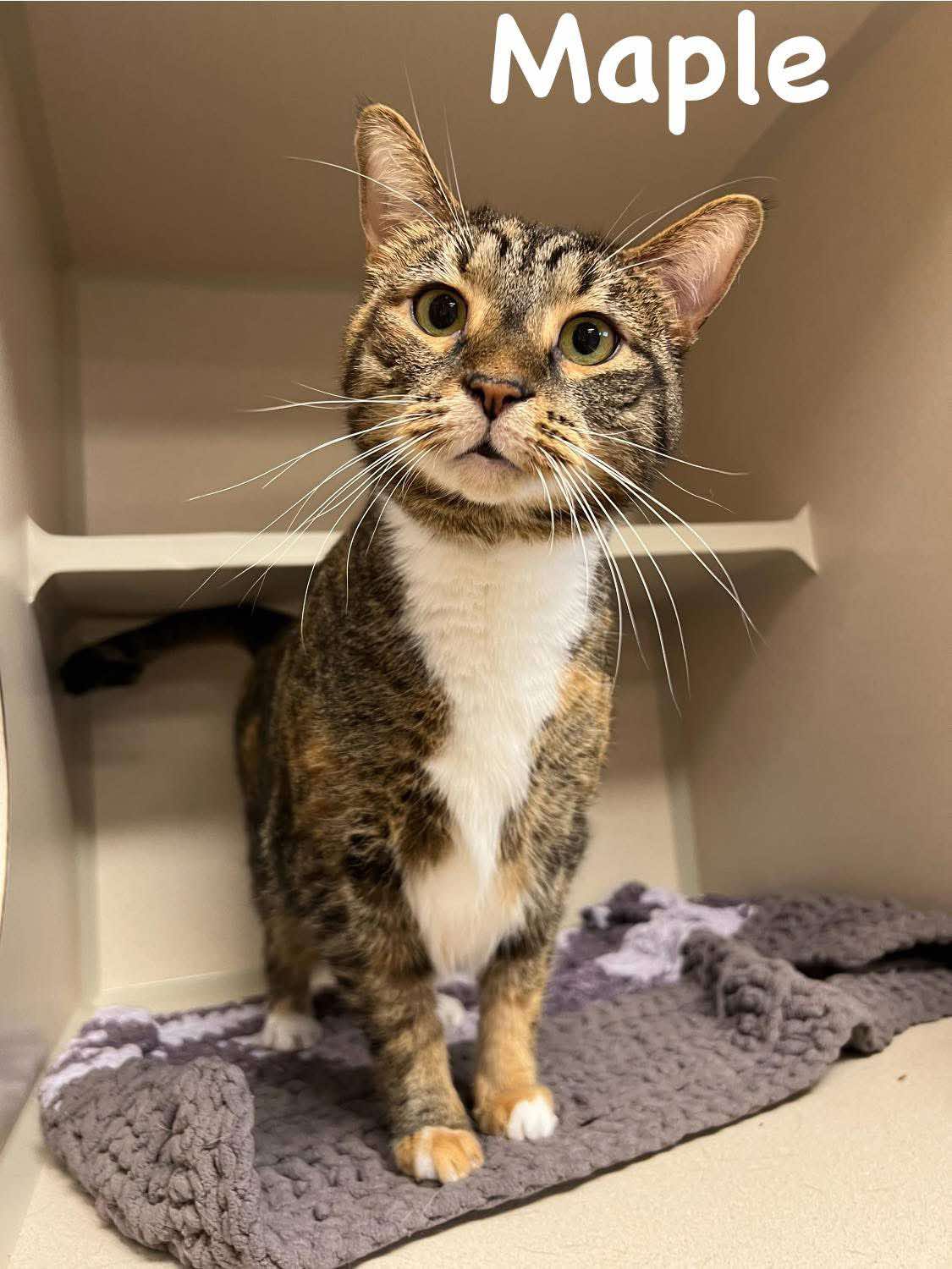Maple is a beautiful 3 year old female Calico Tabby. She is fully vetted, litter trained and will be spayed before heading to her new family. Come see her and you won’t be disappointed!