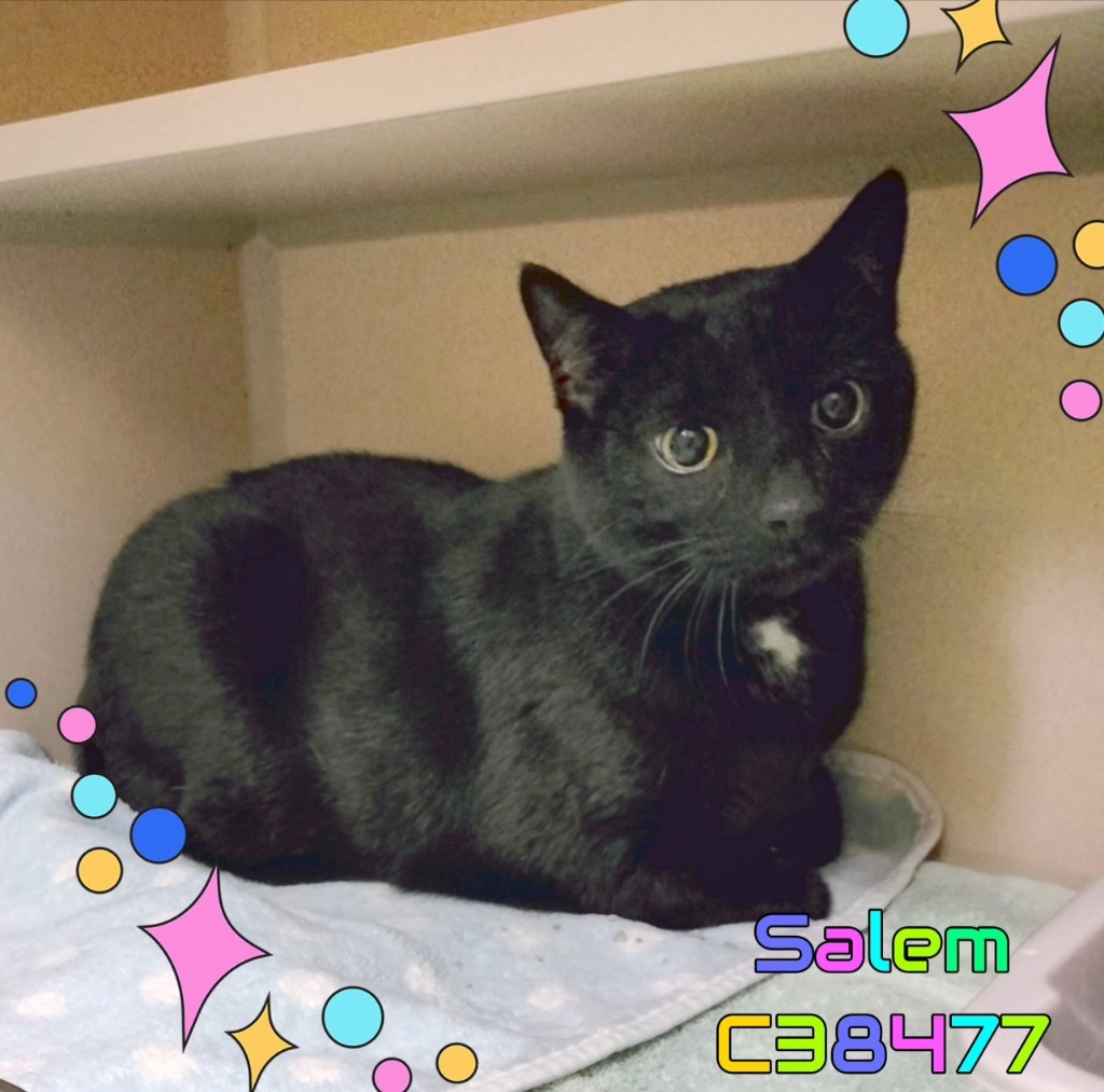 Salem is a male domestic shorthair with a lovely black coat. He is fully vetted, litter trained and is neutered. He will be microchipped before adoption. Salem is looking for his forever family. Come see him in the Cat Room and you won’t be disappointed!