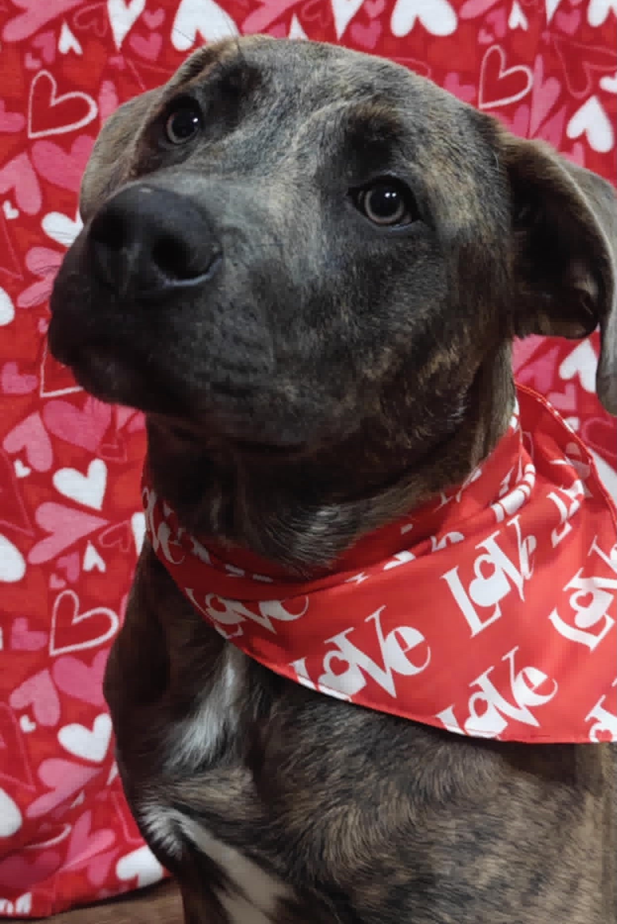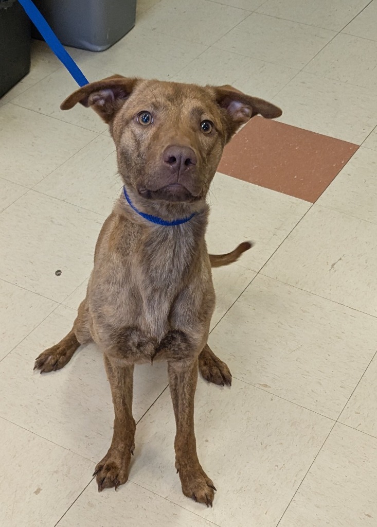Riley is a 6 month old male mixed breed with the prettiest brindle coloring. He is fully vetted and will be neutered/microchipped upon adoption. He was very easy to go out in the yard and is a slight puller on the leash so he might be happier with a harness to help direct his attention. He waited till he was in the yard to do his business so that indicates he might be easy to train. He does know his sit command already and is very eager to learn. Remember puppies need a lot of love, time and patience with training to help them become their best selves.