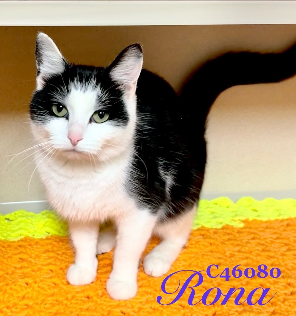 Rona is a beautiful female Domestic Shorthair mix. She has the most gorgeous green eyes. She is fully vetted, and litter trained and will be spayed upon adoption. Come visit her in the Cat room.