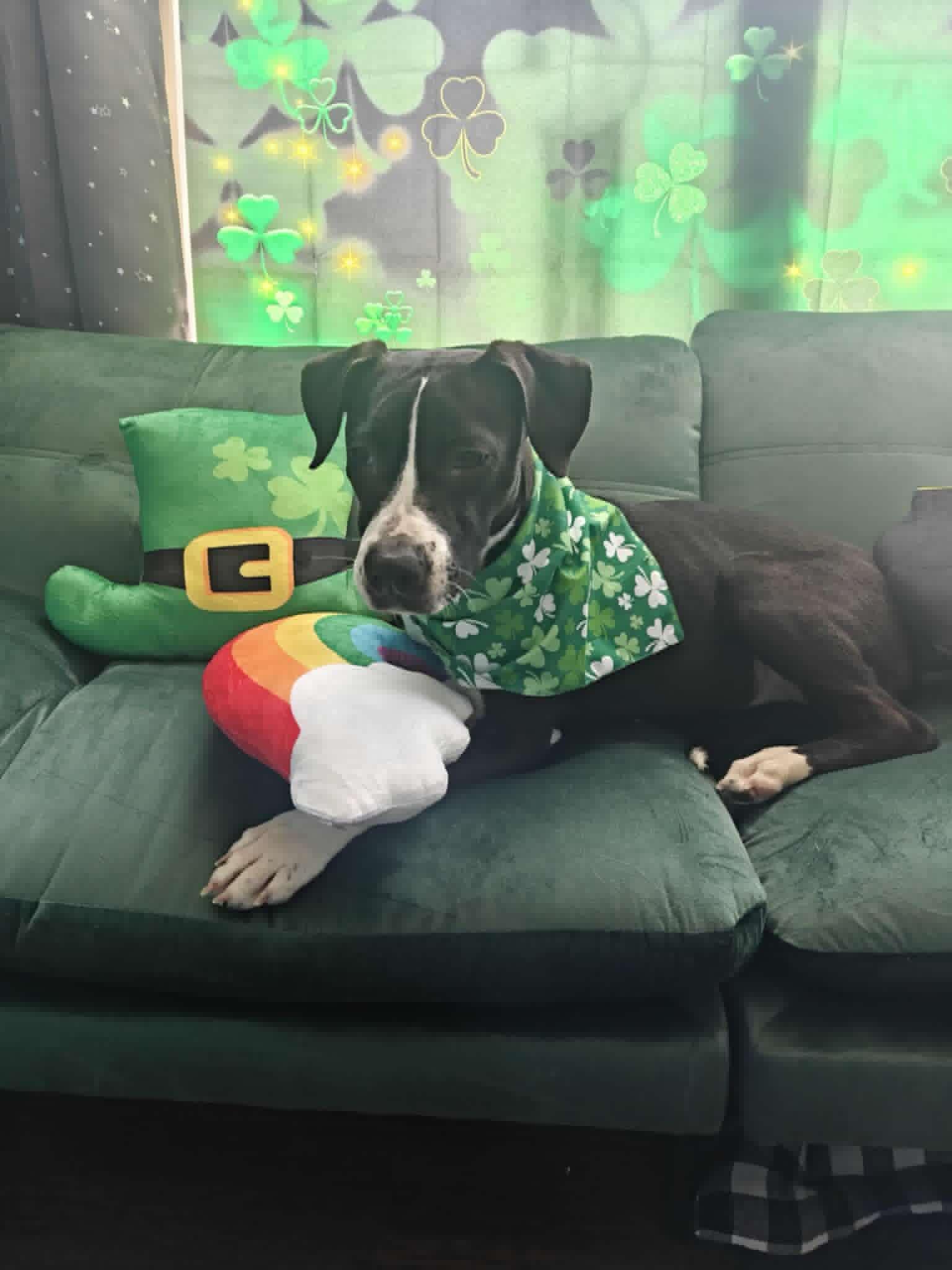 Navi is a 6 month old female mixed breed. She is sporting her Green and hoping for the luck of the Irish by hitting the forever family jackpot. Might that be you? She is fully vetted, crate/house trained and good with other dogs. She is not yet spayed. Navi will make a great outdoor jogging and hiking partner and loves being with people. She is still young enough to continue her training and help her grow into a wonderful companion. Please remember to check any breed/pet restrictions if renting or you live on Post.