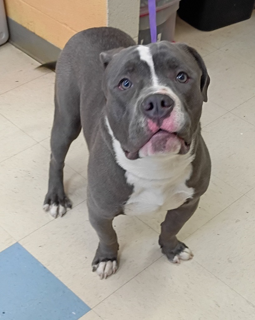 Bruce is an adult male American Staffordshire mix. He is fully vetted and will be neutered and chipped upon adoption. Also, please remember to check ALL breed restrictions and policies if renting or living on Post. Be prepared before adopting.