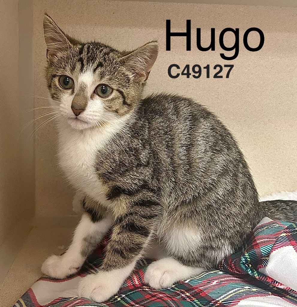 Hugo is a male Domestic Shorthair kitten. He is fully vetted, litter trained and will be neutered upon adoption. Come see him in the Cat Room.