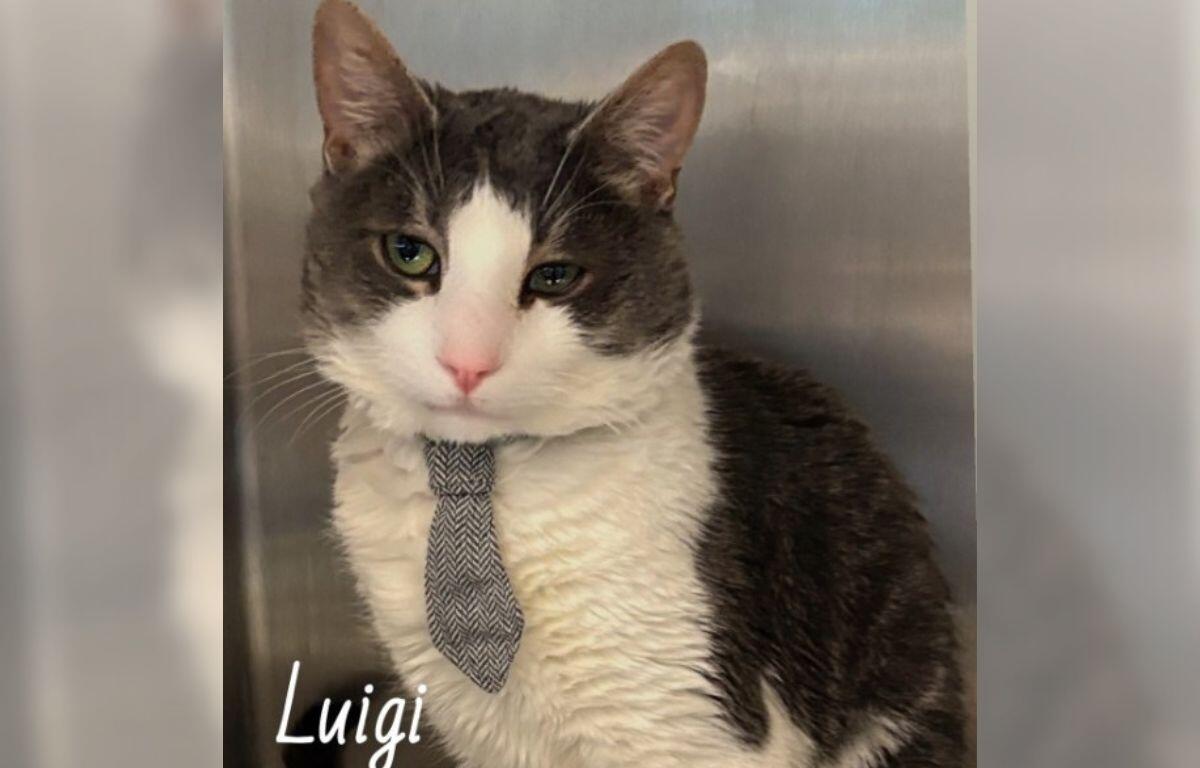 Luigi is an adult male domestic shorthair and he is sporting his best tie just waiting for you to come visit him. He is fully vetted, litter trained and will be neutered upon adoption. He is in the Cat room.
