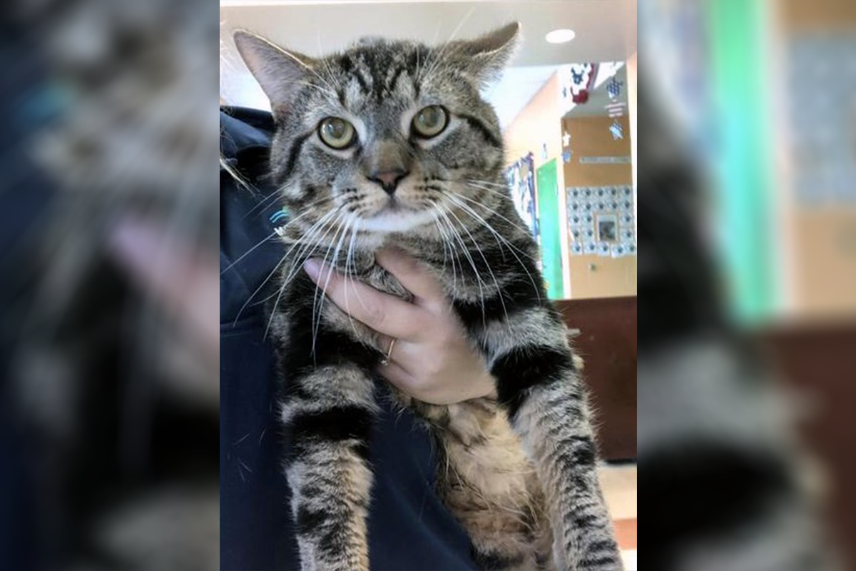 Floozy is a medium-sized adult male domestic shorthair with beautiful dark stripes. He is very mellow and enjoys being held and petted. Floozy would make a great companion.e is He