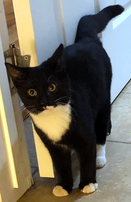 Harry is a 4-5-month-old neutered male tuxedo whose real name should be Mischief. He is fully vetted and litter box trained. Harry is full of energy and loves to play. He likes to rub on your legs and purr a lot. He does not like being held and cuddled but makes up for it with his mischievous behavior.