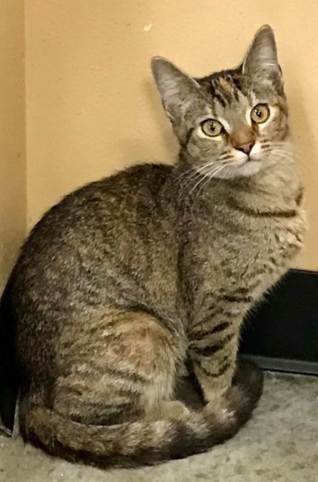 Honey is a 5-month-old, spayed shorthaired female tabby with a beautiful face. She has a sweet personality and likes to explore her surroundings. Honey is fully vetted, spayed, and she is litter trained. She would love to have a real home to explore.